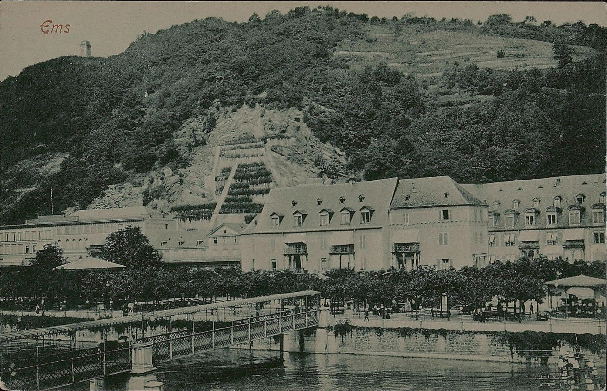 Lahnpartie mit Kurhaus/Kurhotel und Gitternetzbrücke
