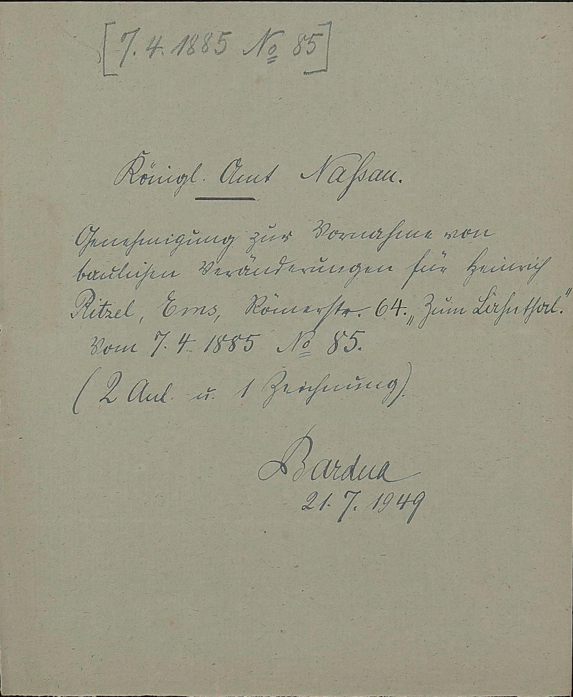 Waschküche und Kamine des Hauses "Zum Lahntal"/"Lahntal" des Heinrich Ritzel/Johann Julius (Jean) Berg und Elise geb. Berchem/Christian Kaffine/Philipp Schulz und Maria geb. Köpper/Hans Alfred Schulz/Karl Christian Schulz/Heinrich Schulz/W. A. Henninger Bad Ems Römerstraße Nr. 55 (64) Flur 92 Nr. 8 (2, 17, 19)