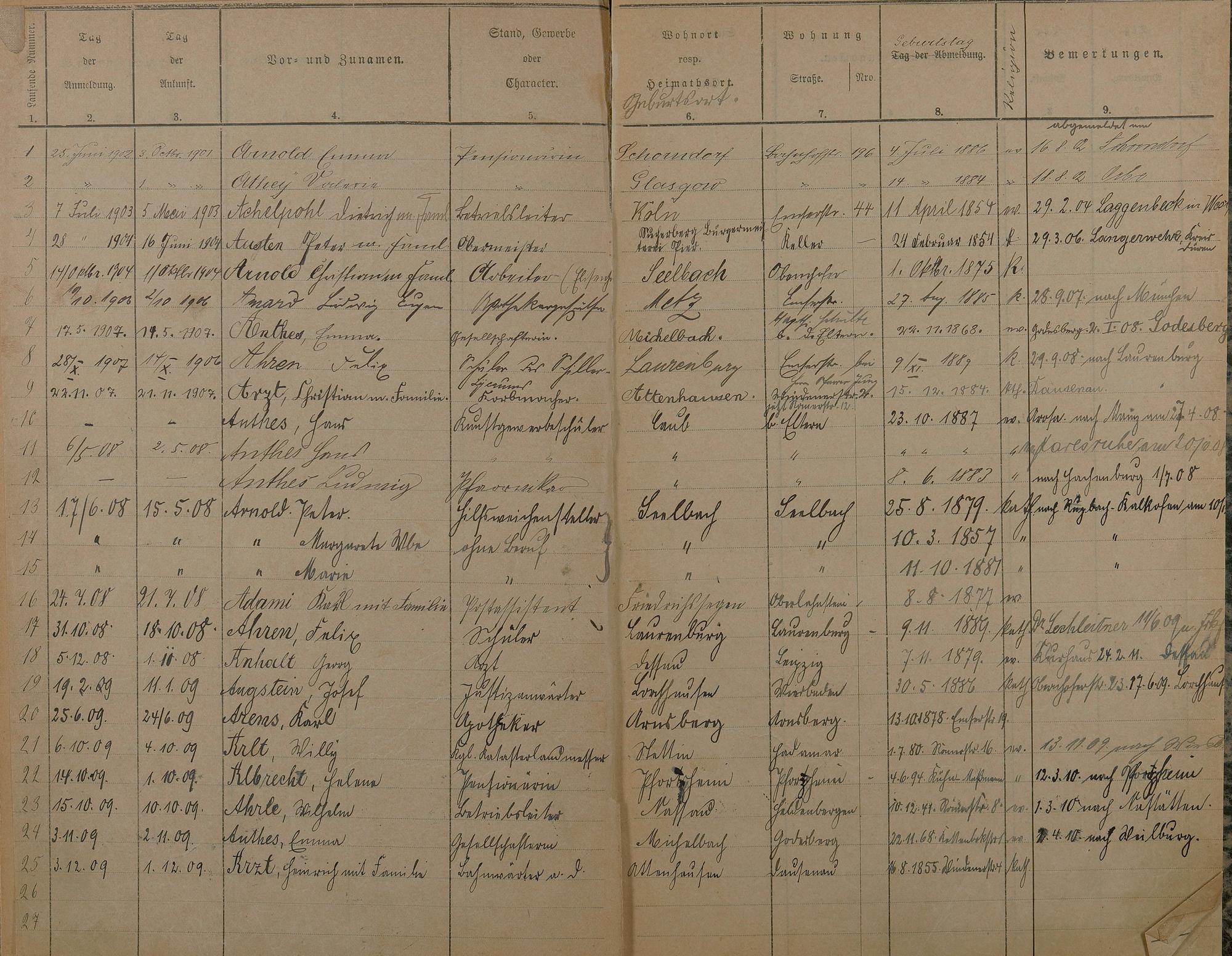 Melderegister 1902 - 1909 A - Z