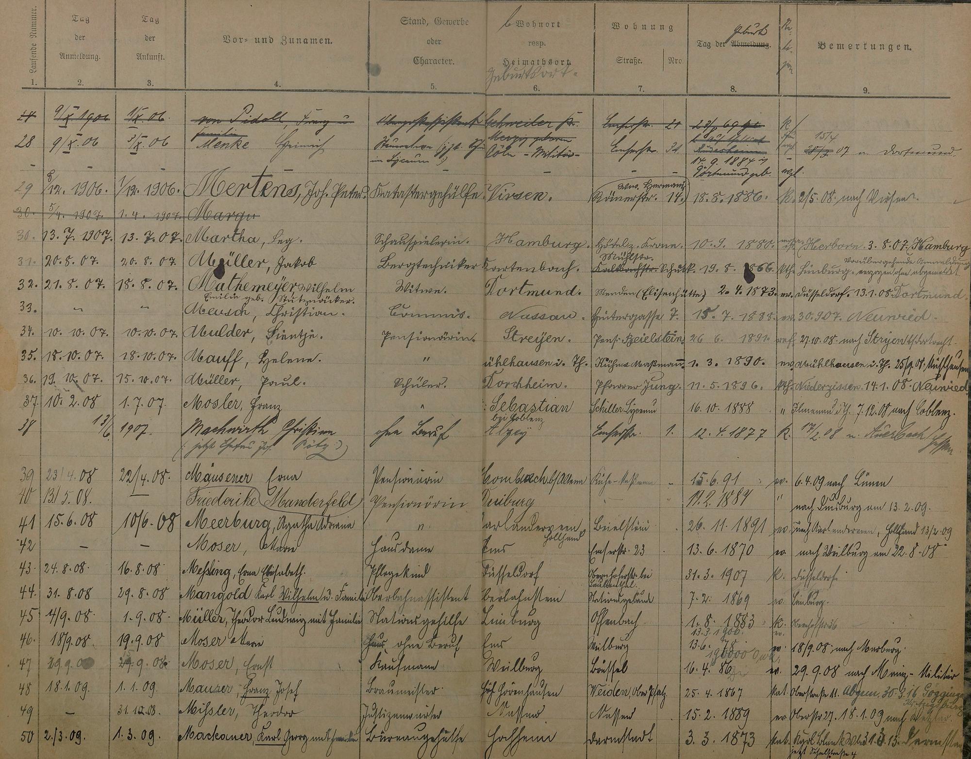 Melderegister 1902 - 1909 A - Z