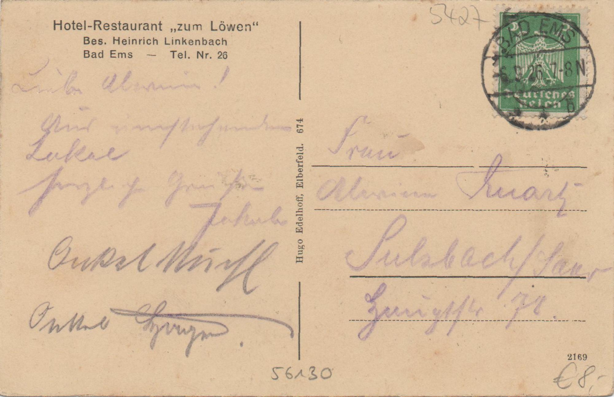 Hotel "Zum goldenen Löwen"/"Zum Löwen" des Heinrich Linkenbach Bad Ems Lahnstraße Nr. 2 - Speisesaal/Restaurant
