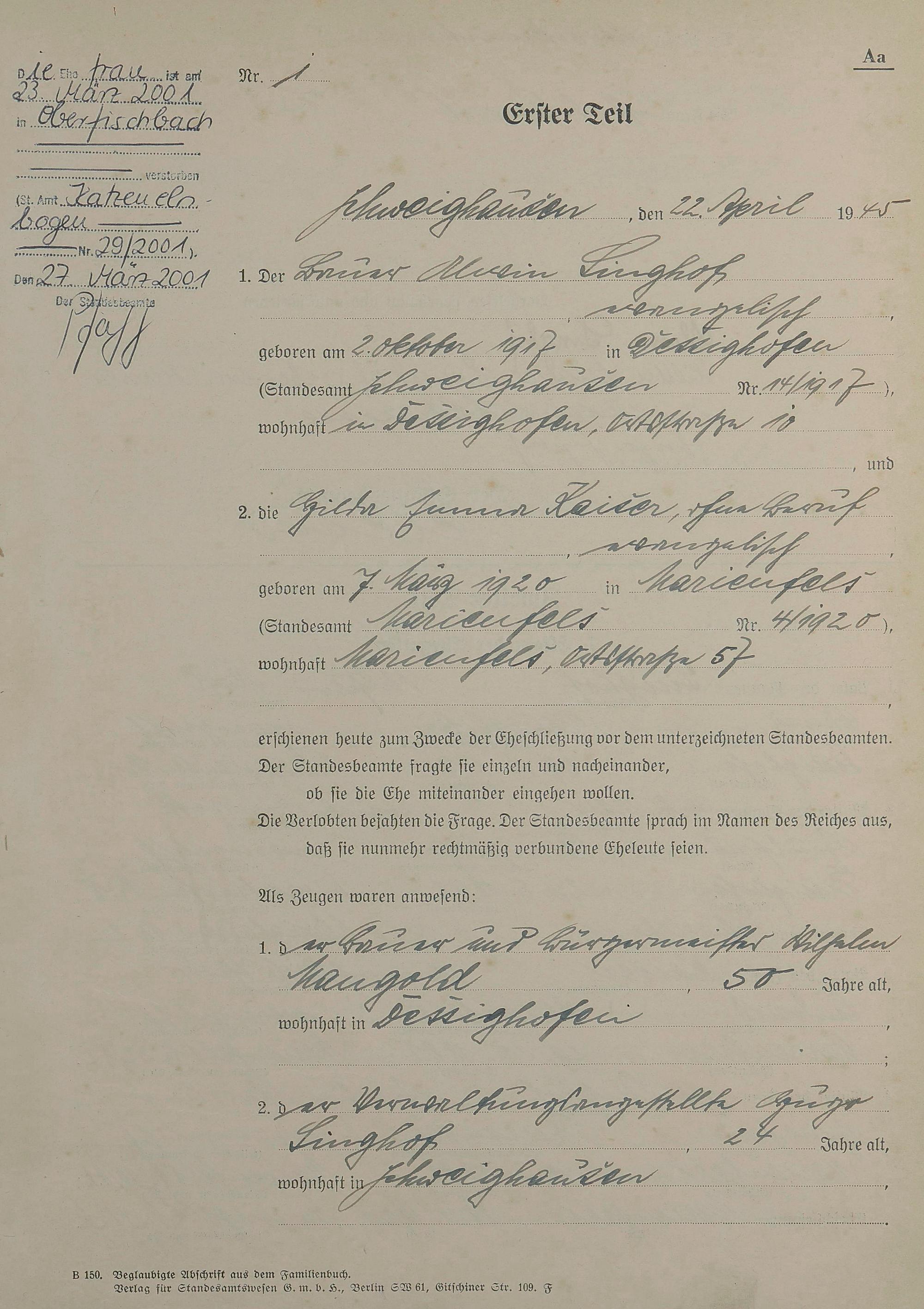Heiratsregister 1945