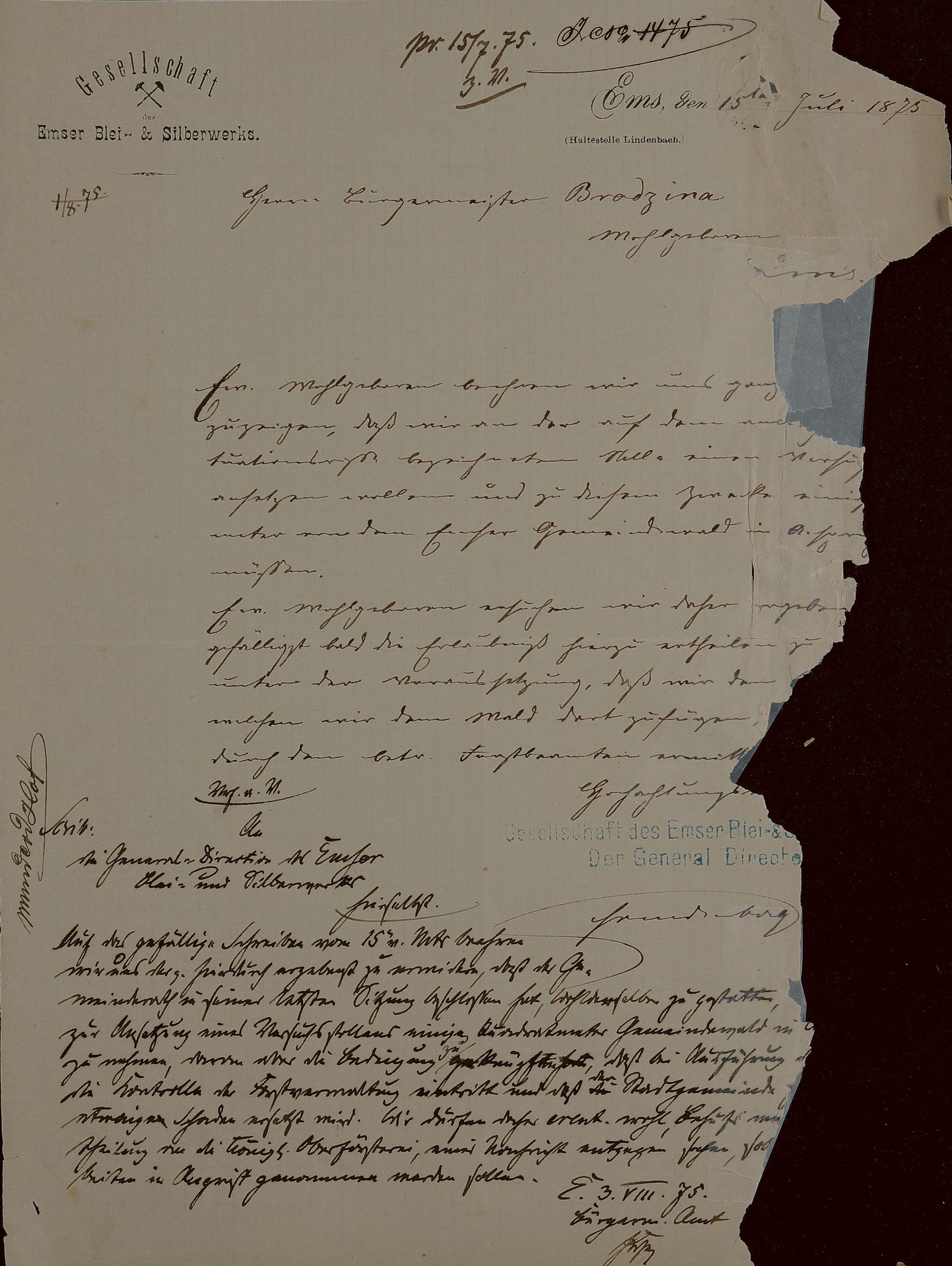 Bauangelegenheiten der Gewerkschaft Remy, Hoffmann & Co. Bendorf/Gesellschaft des Emser Blei- und Silberwerks/AG für Bergbau-, Blei- und Zinkfabrikation zu Stolberg i.W./Gewerkschaft Merkur