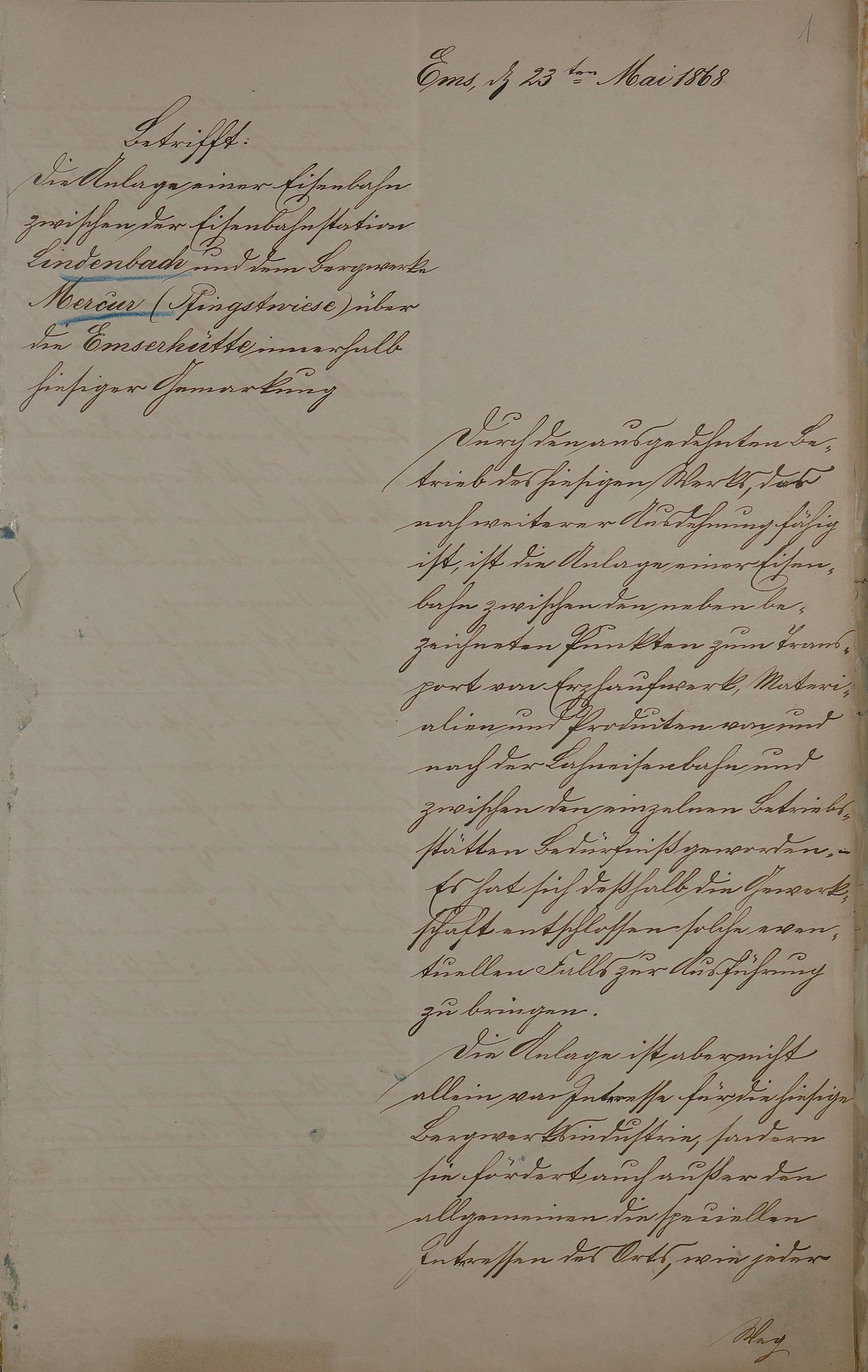 Bau einer Werkseisenbahn des Emser Blei- und Silberwerks vom Bahnhof Lindenbach zum Bergwerk Mercur