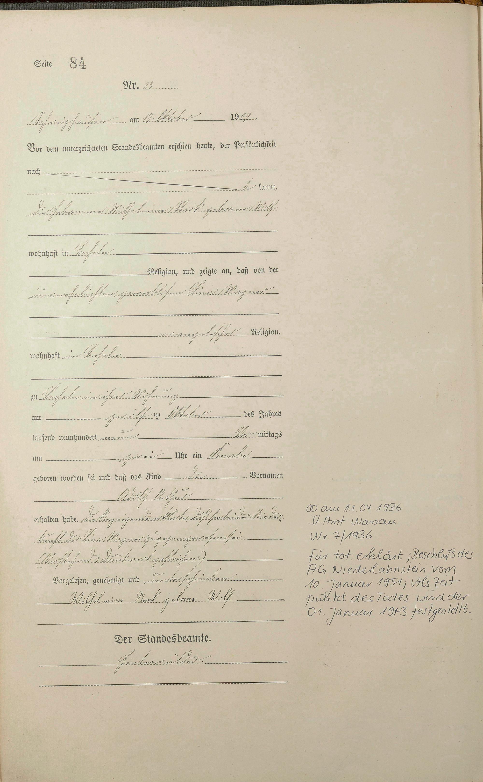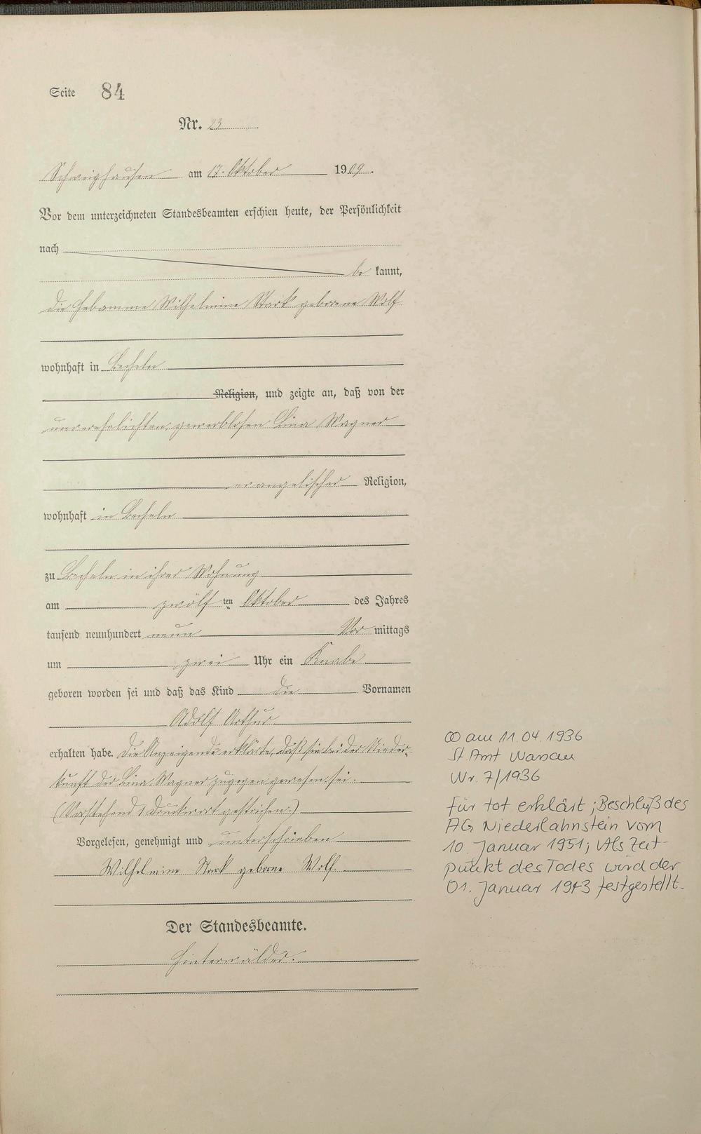 Geburtsregister 1909