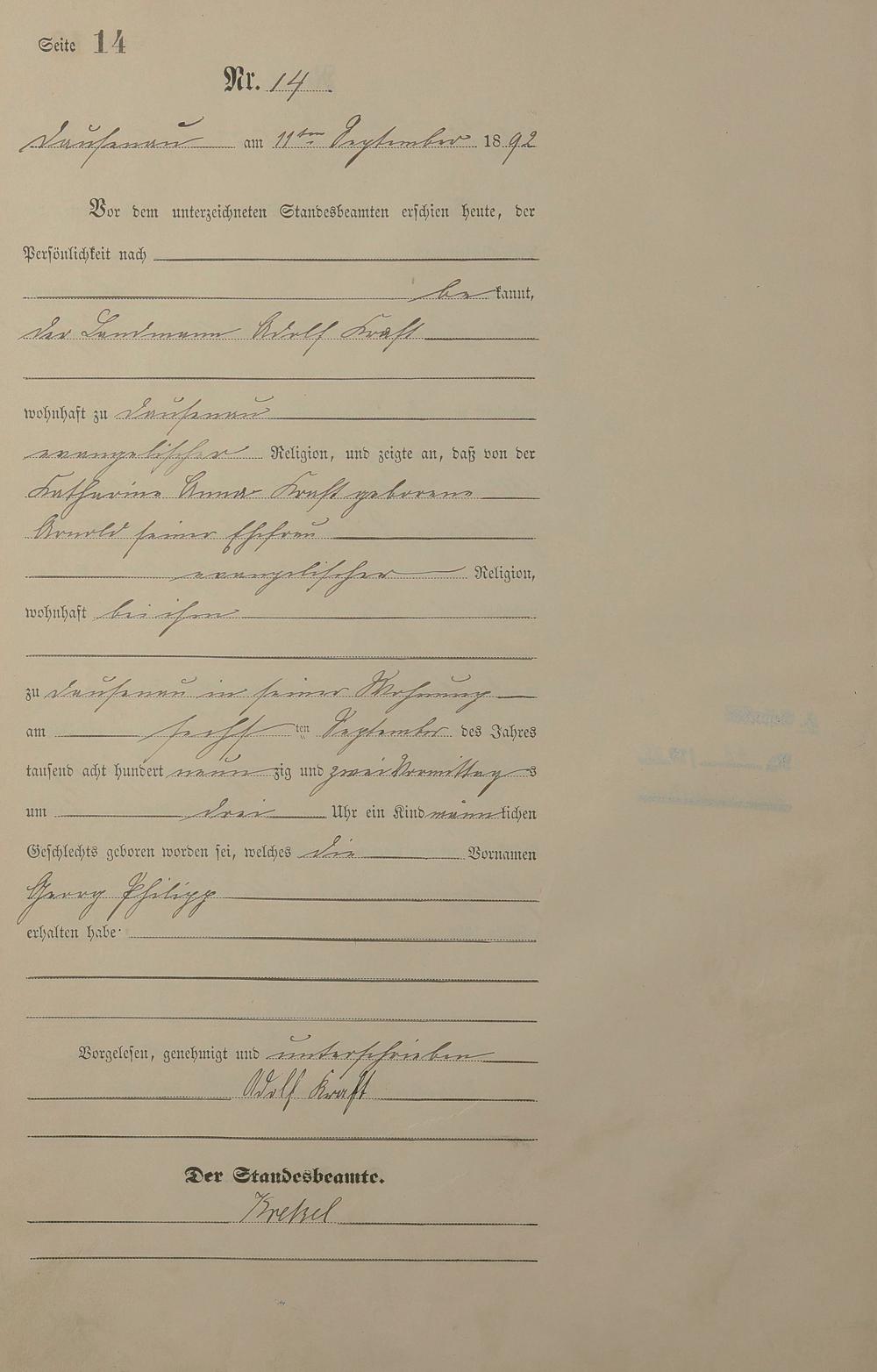 Geburtsregister 1892