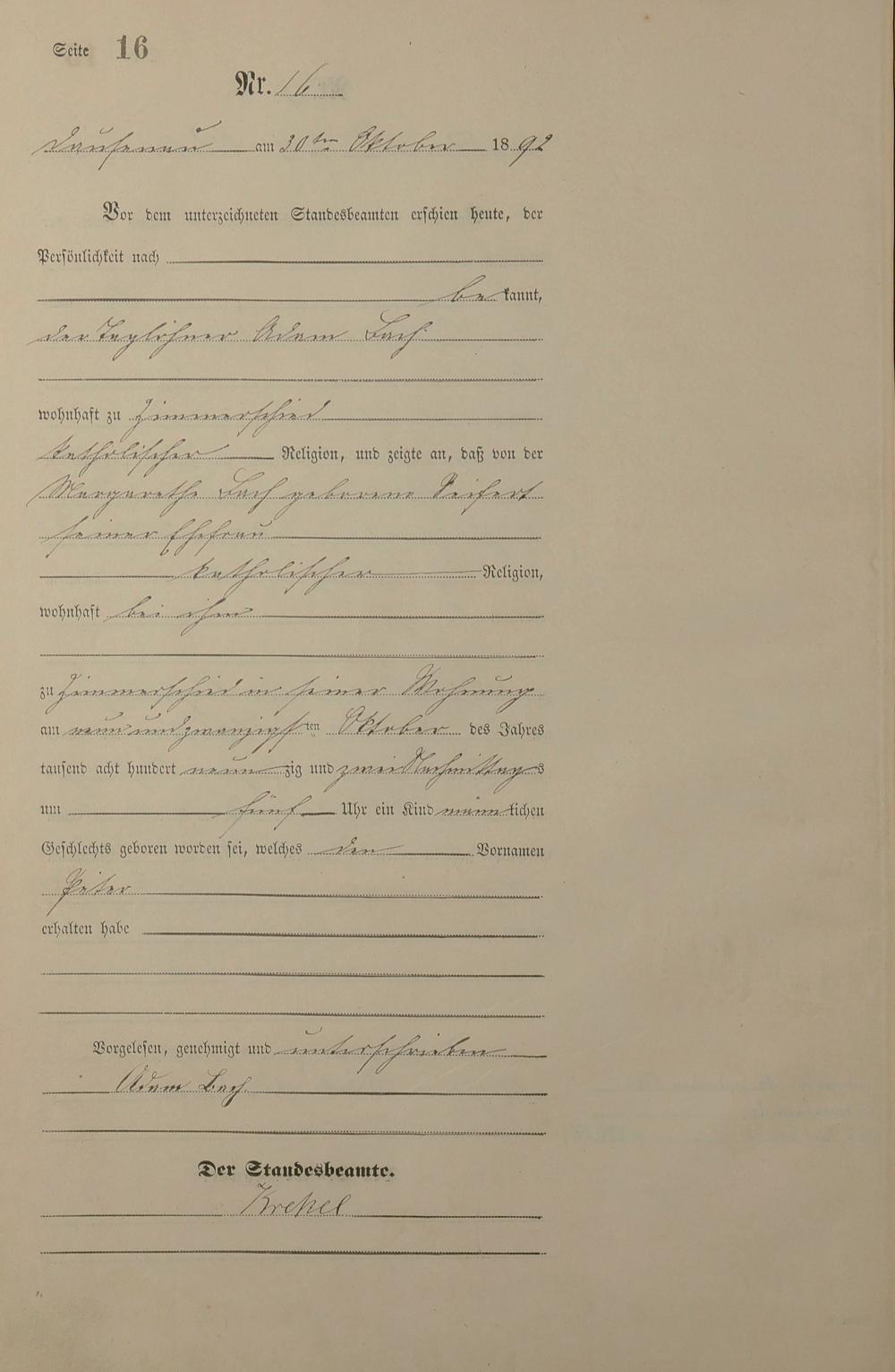 Geburtsregister 1892