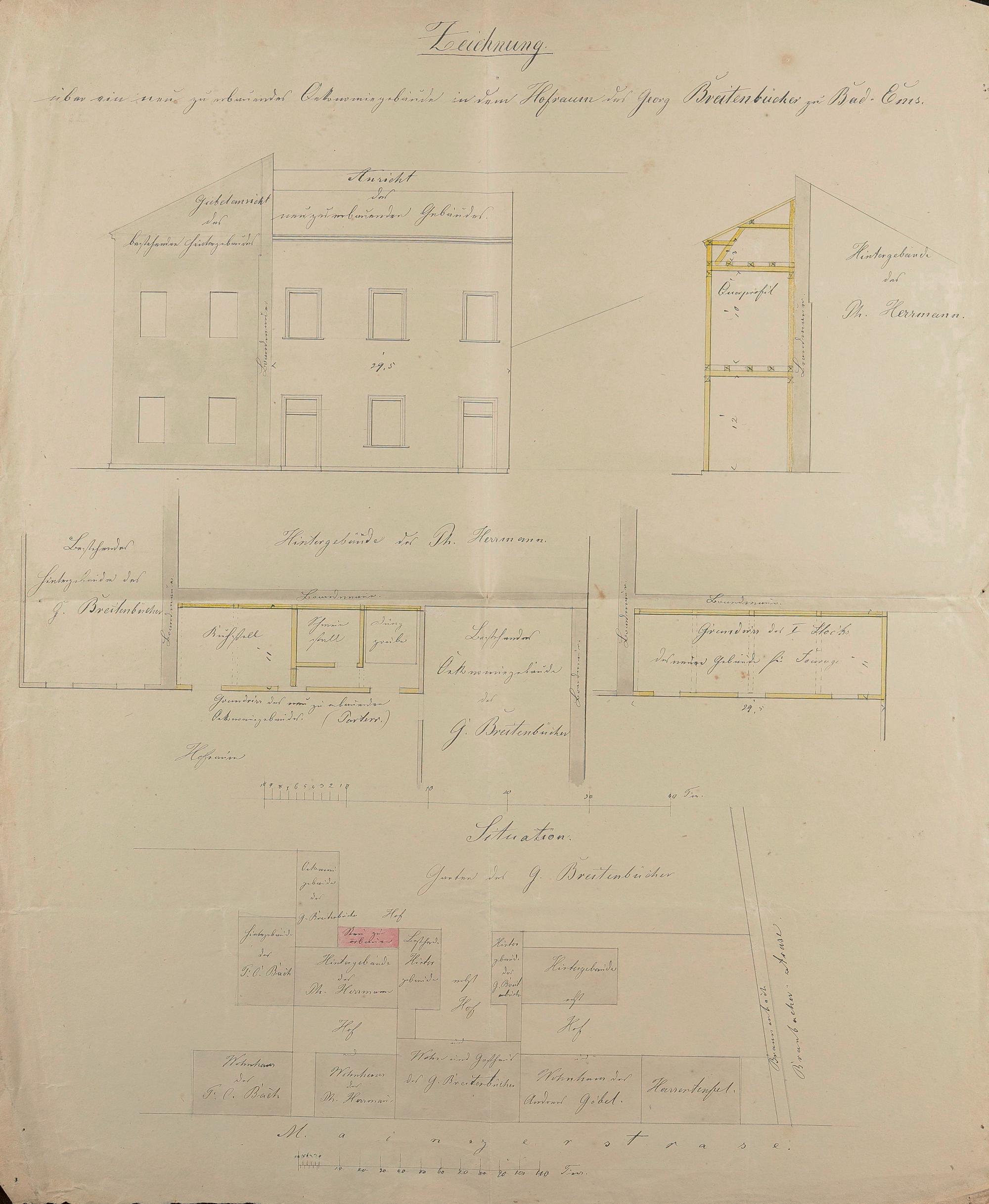 Wirtschaftsgebäude des Wohnhauses/Hotel "Guttenberg" des Georg Breitenbücher und Louise geb. Baumann/Franz Ermisch und Charlotte geb. Brocker/August Schöpwinkel und Alma geb. Müller/Johann Niesen/Gustav Kuckenberg und Clementine geb. Bongart/Nassauer Landesbank/Franz Xaver Müller und Walburga geb. Riedel Bad Ems Bahnhofstraße Nr. 11, 12 und Mainzer Straße Nr. 5 (4, 5) Flur Nr. 36 und 37/3 (137/31)