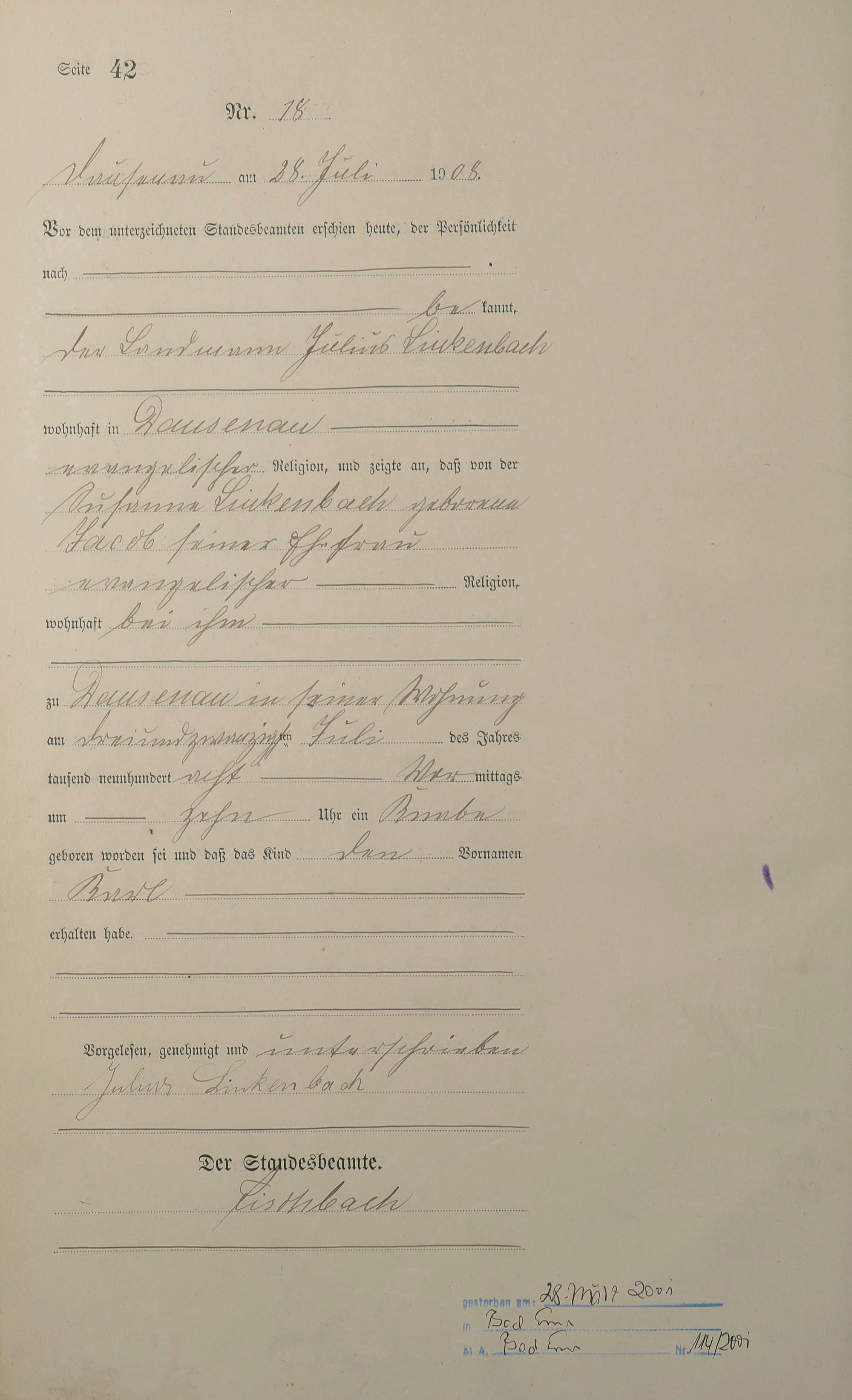 Geburtsregister 1908
