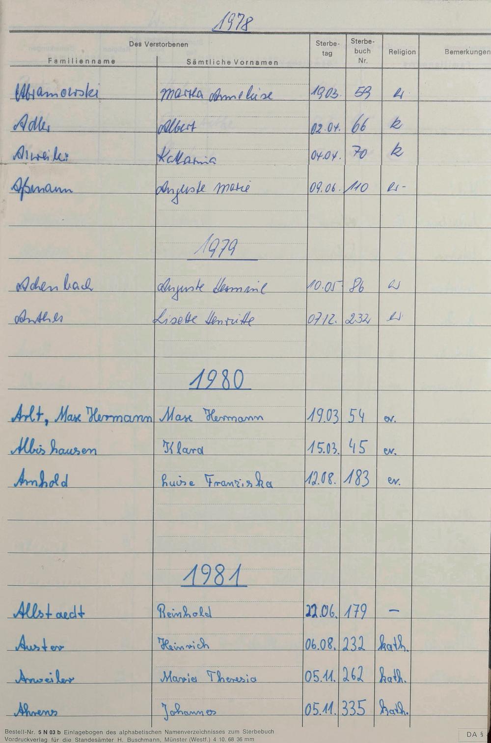 Register A-Z zum Sterberegister 1974-1995