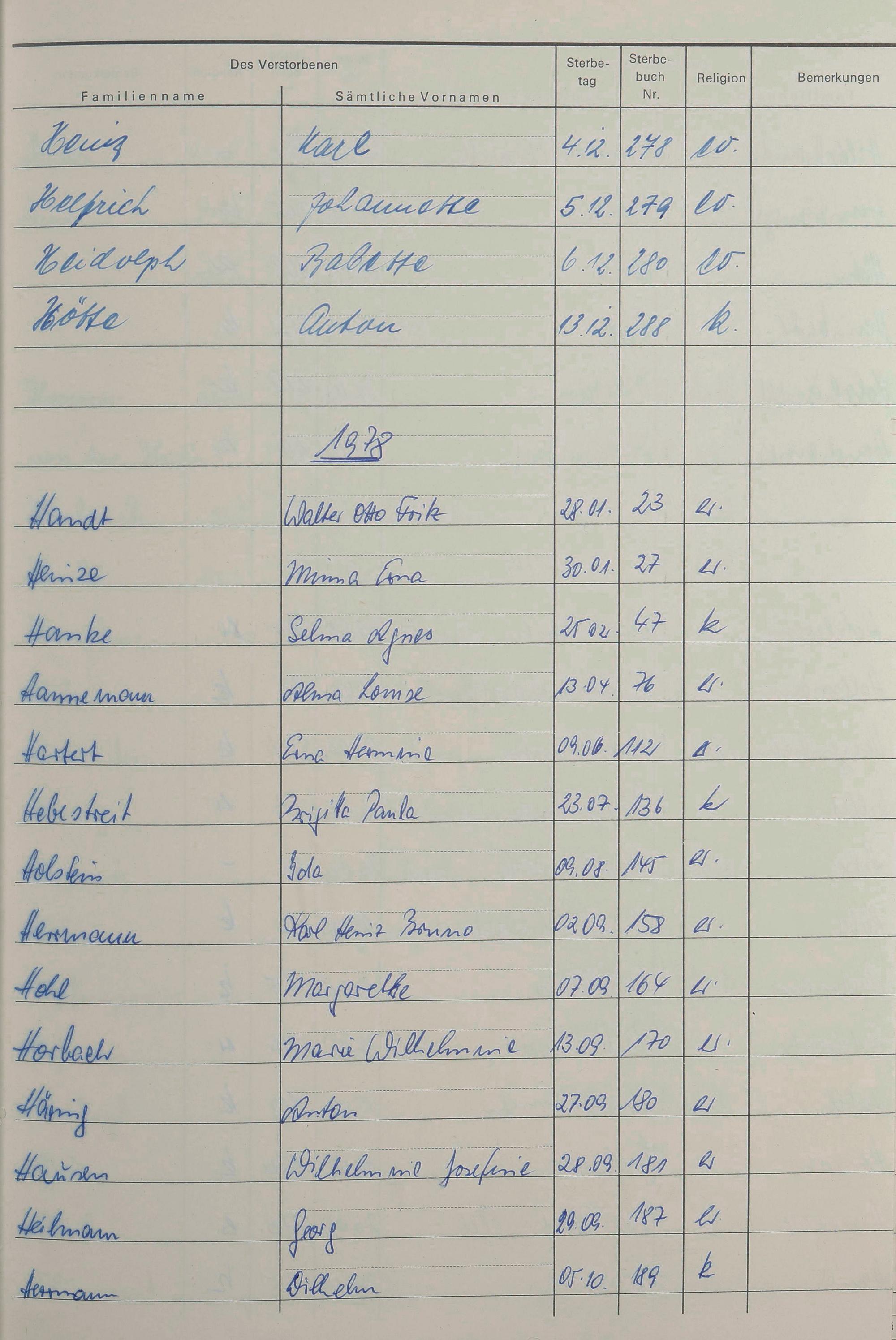 H - Register Sterbefälle 1974-1995