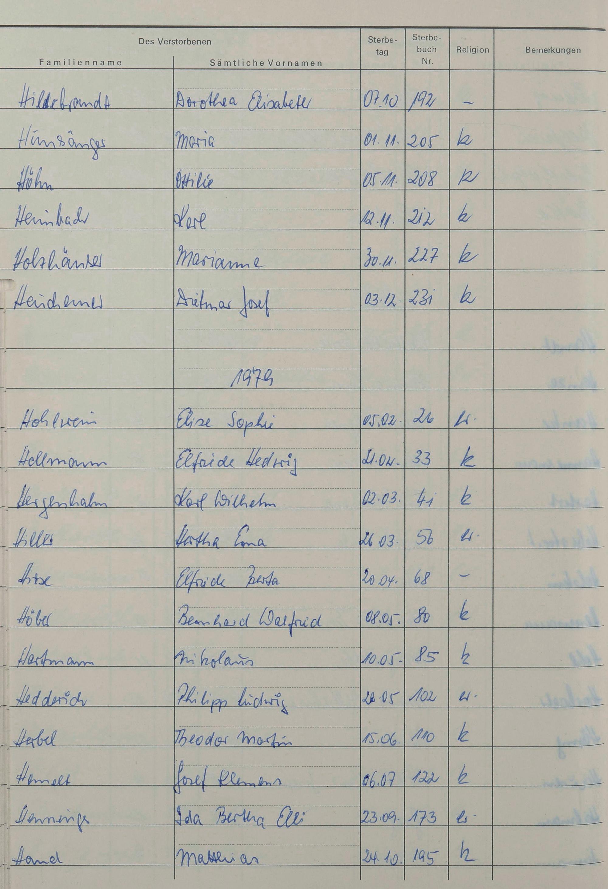H - Register Sterbefälle 1974-1995