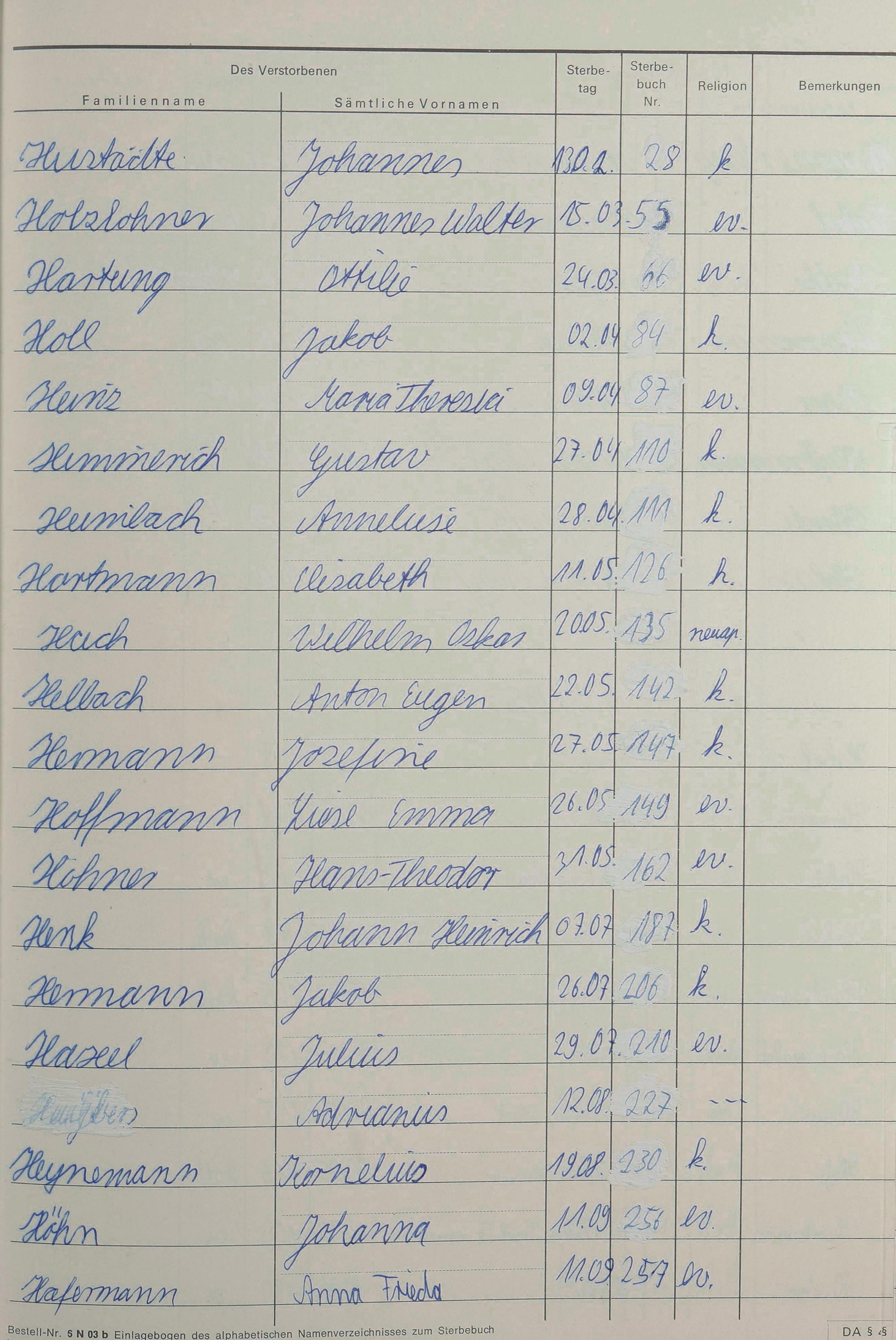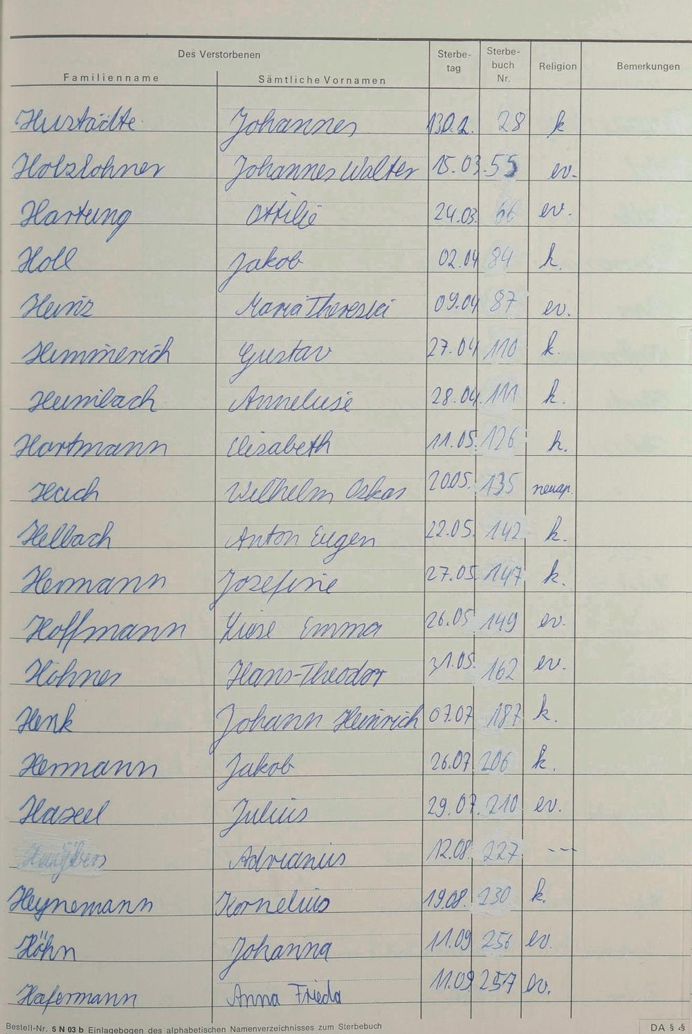 H - Register Sterbefälle 1974-1995