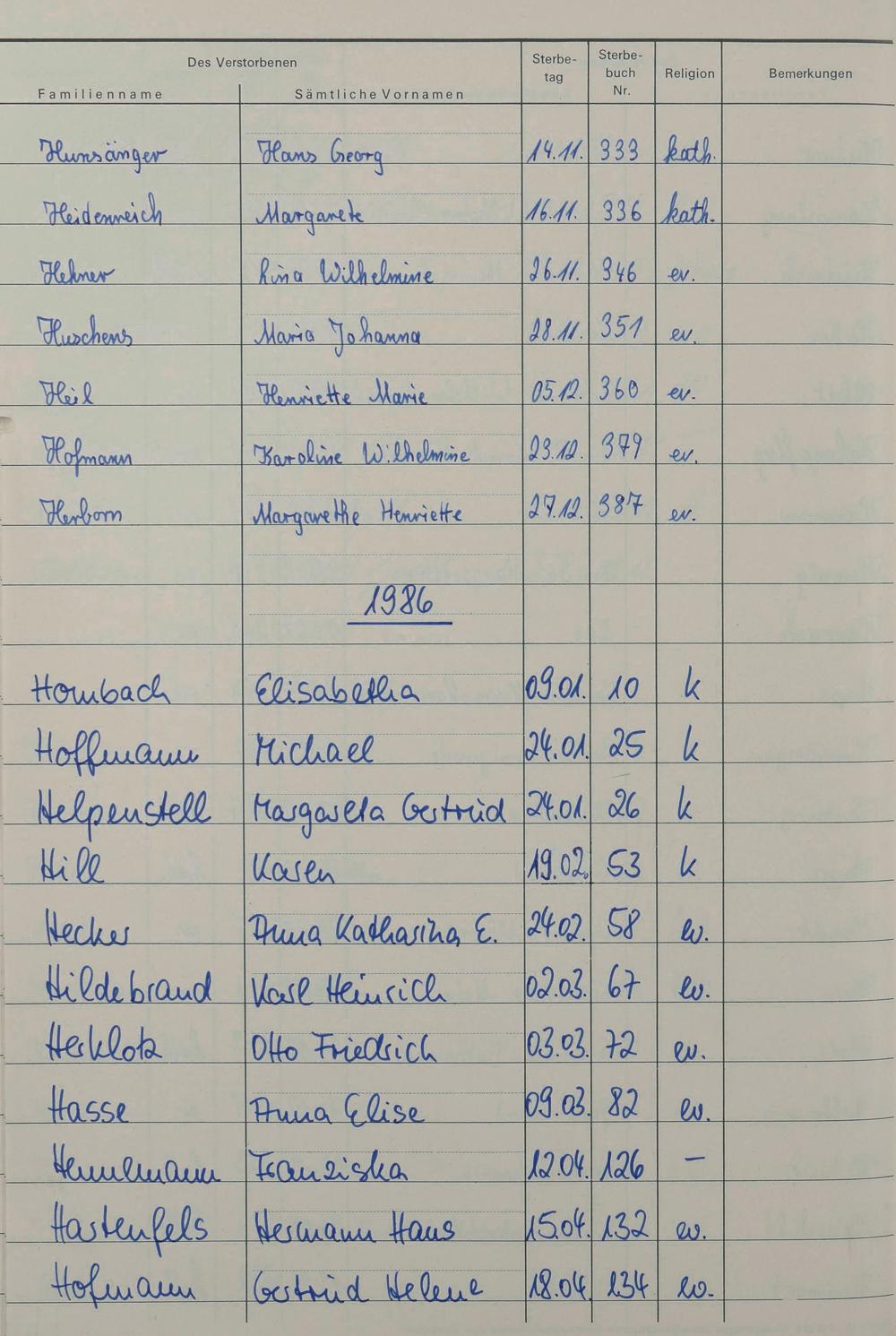 H - Register Sterbefälle 1974-1995