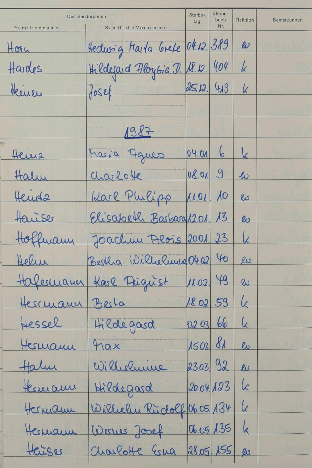 H - Register Sterbefälle 1974-1995