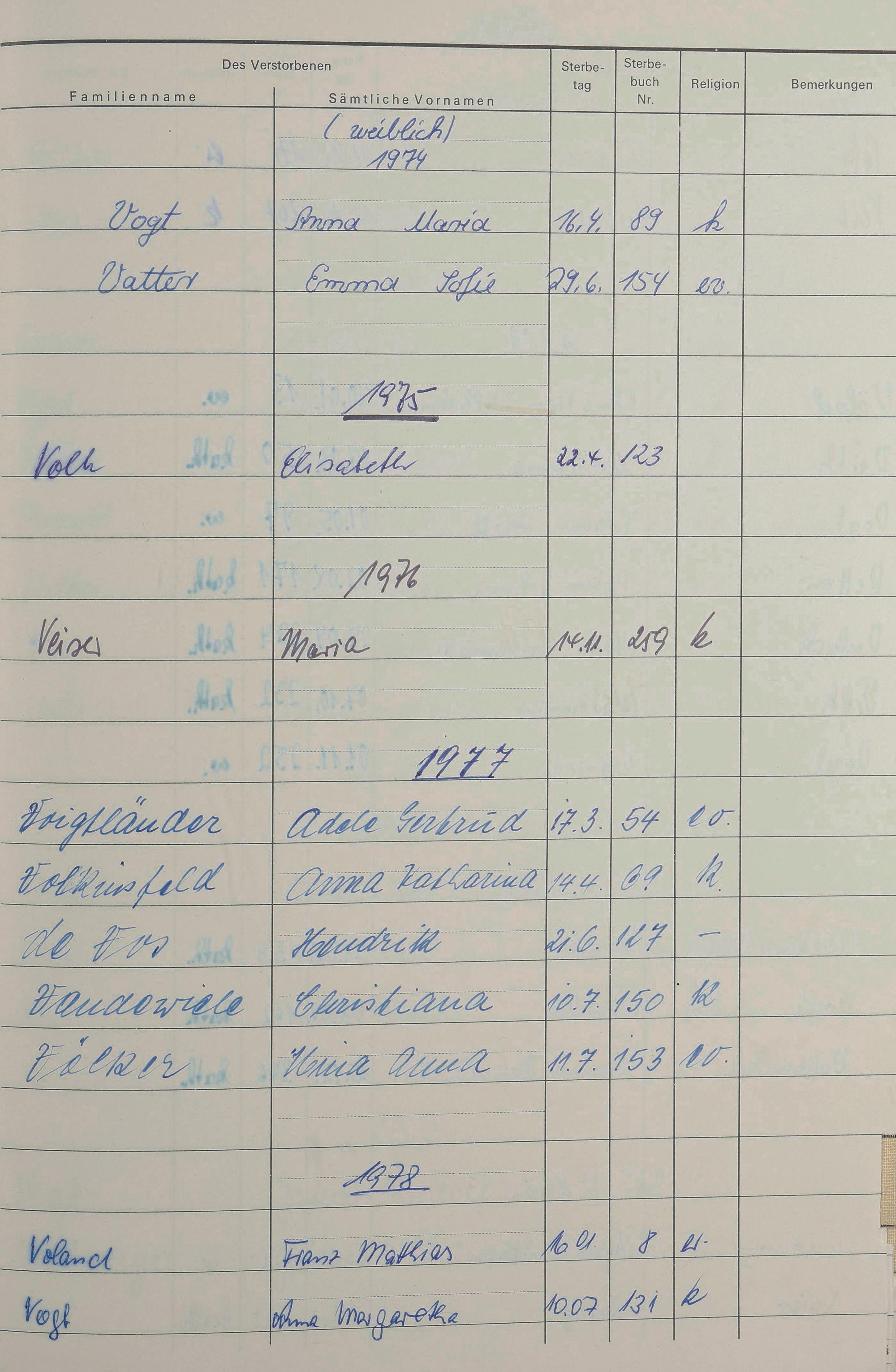 V - Register Sterbefälle 1974-1995