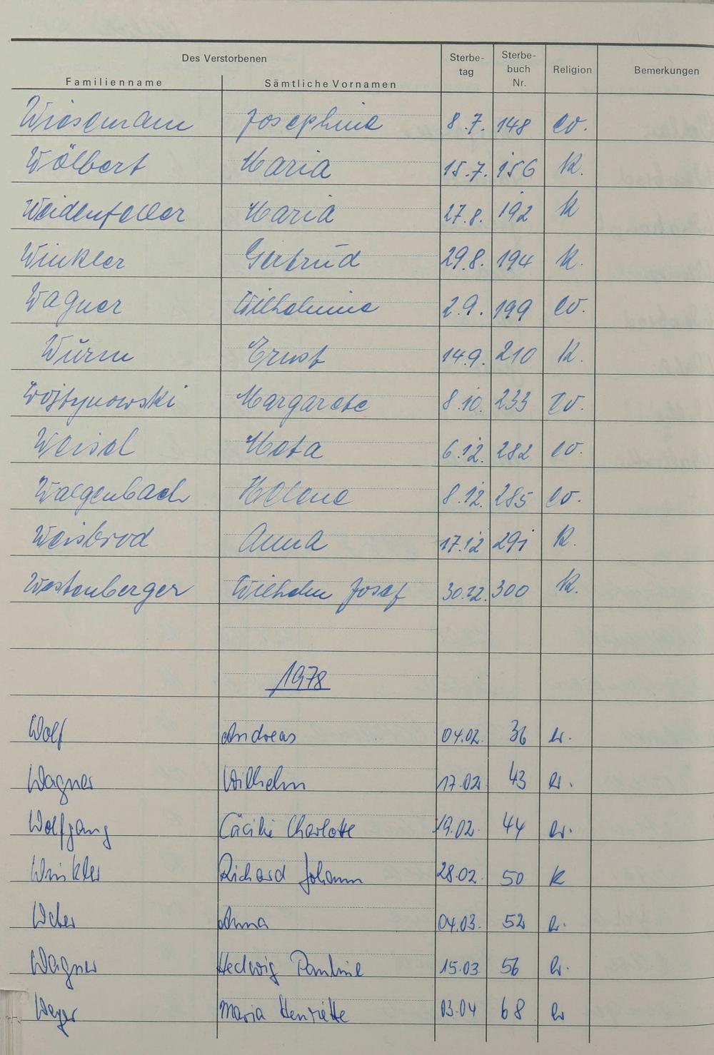 W - Register Sterbefälle 1974-1995