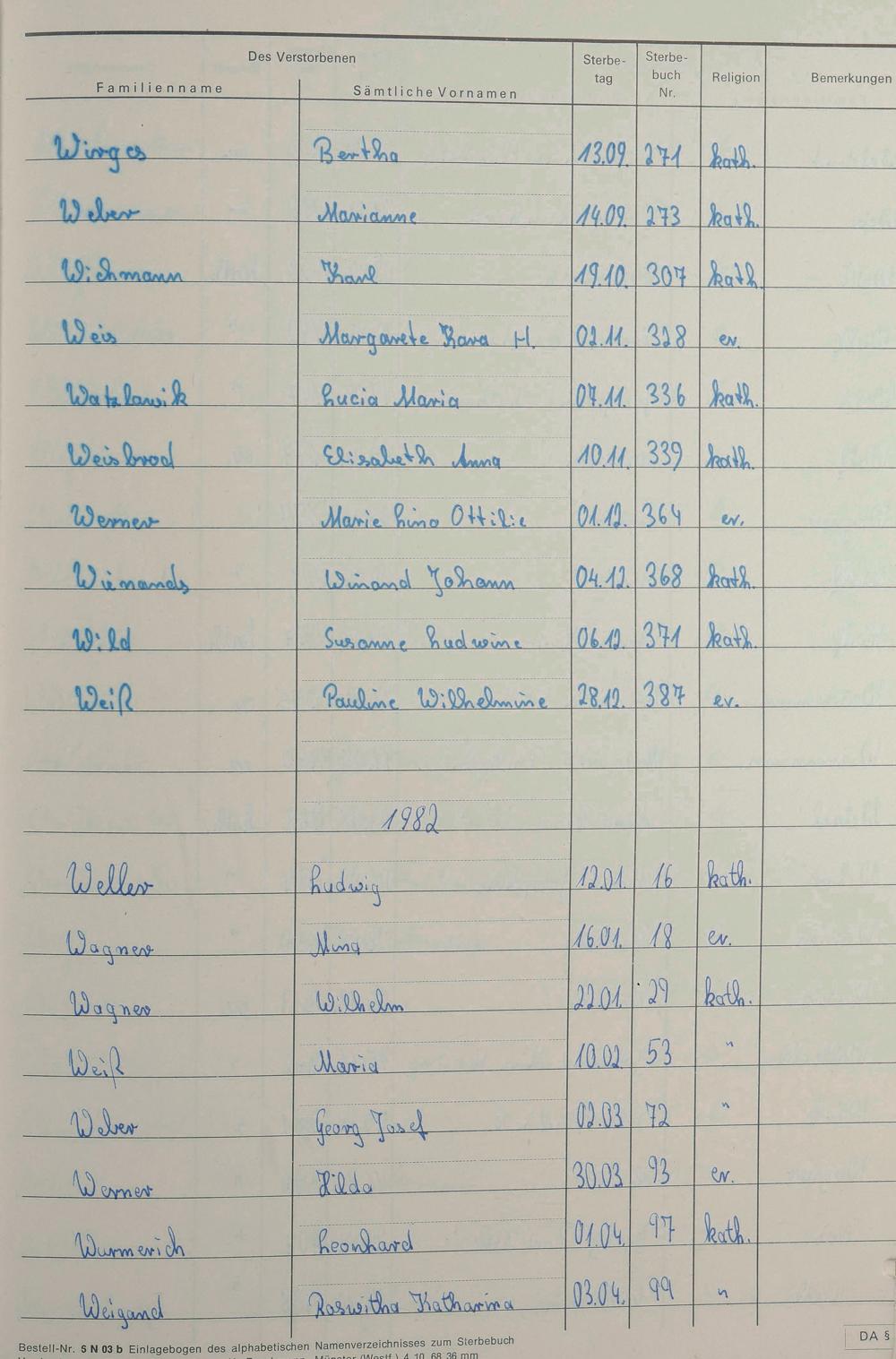 W - Register Sterbefälle 1974-1995