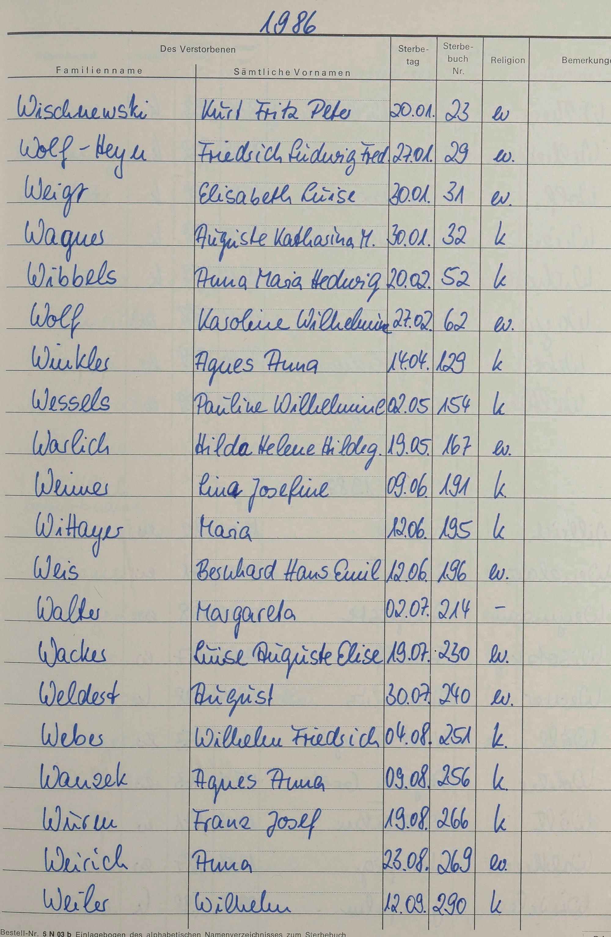 W - Register Sterbefälle 1974-1995