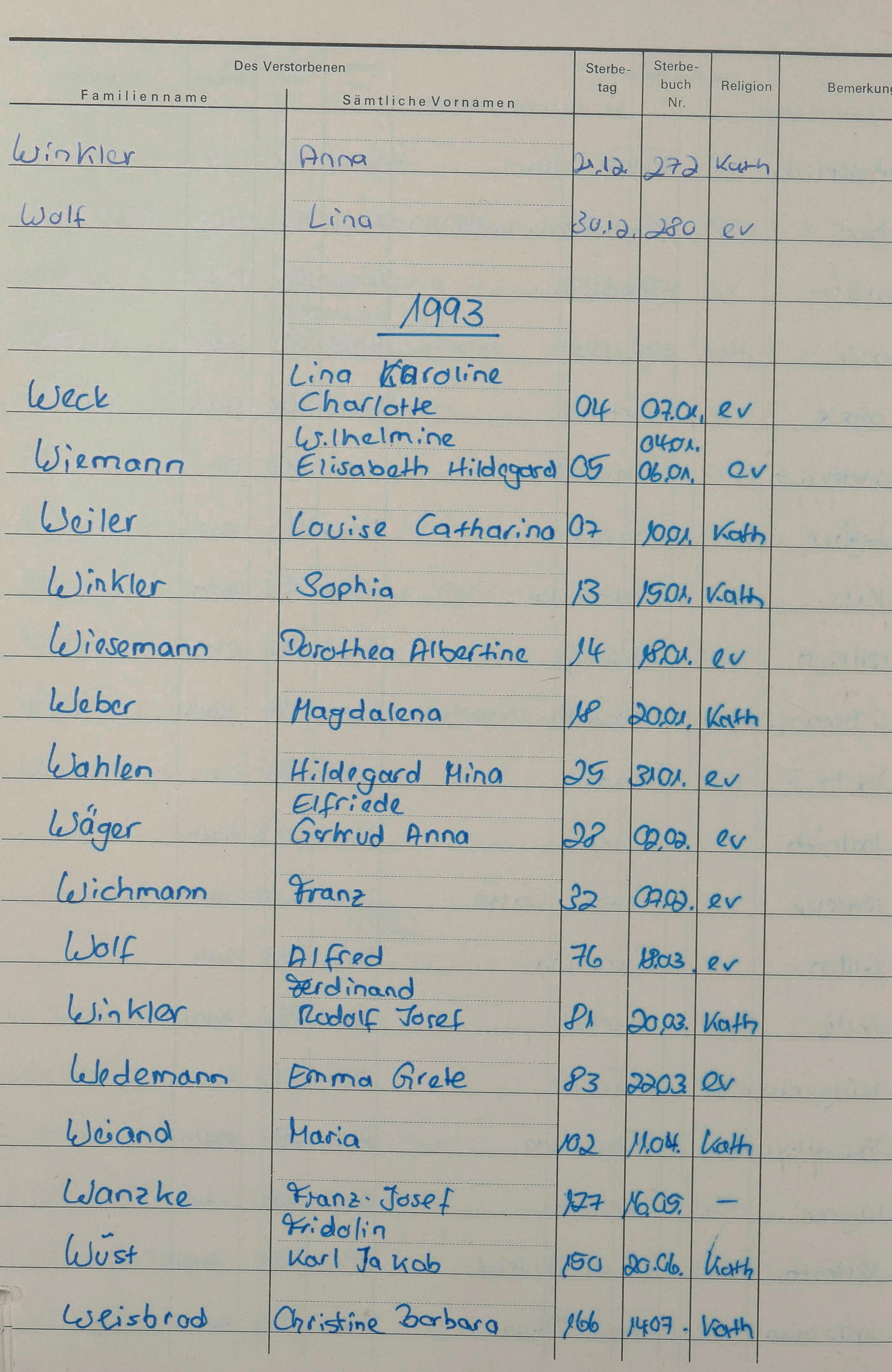 W - Register Sterbefälle 1974-1995