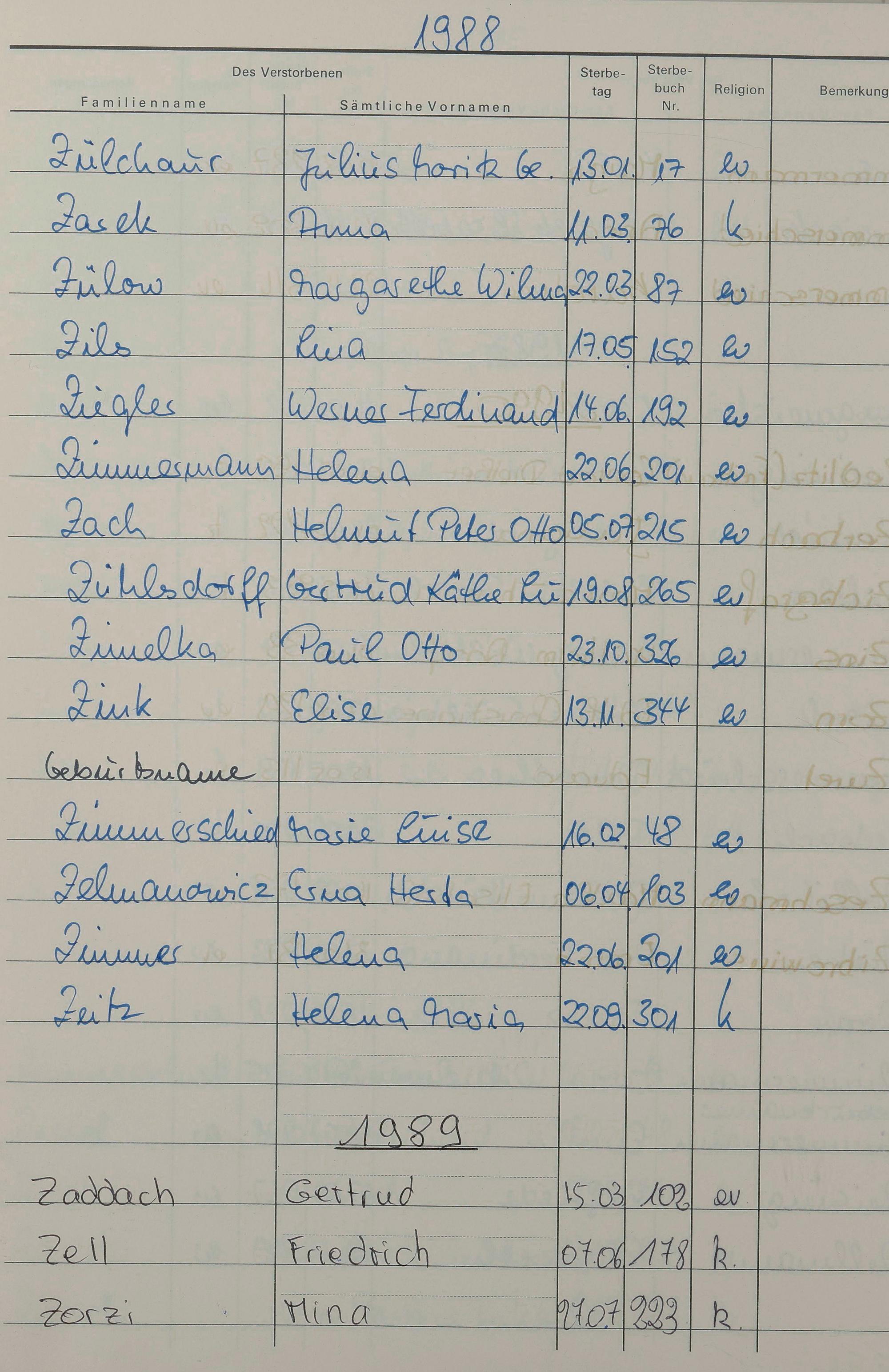 Z - Register Sterbefälle 1974-1995