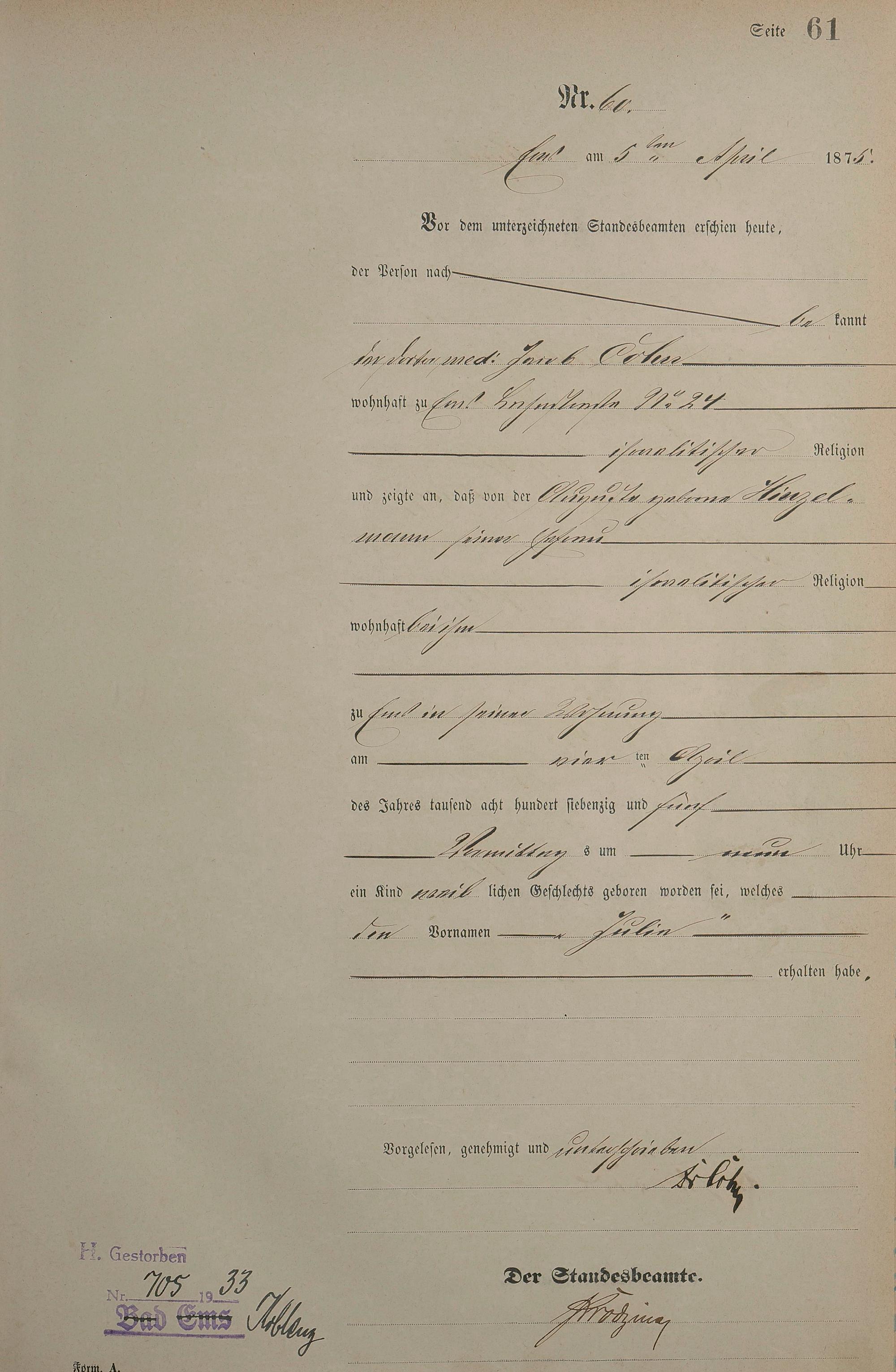 Geburtsregister 1875