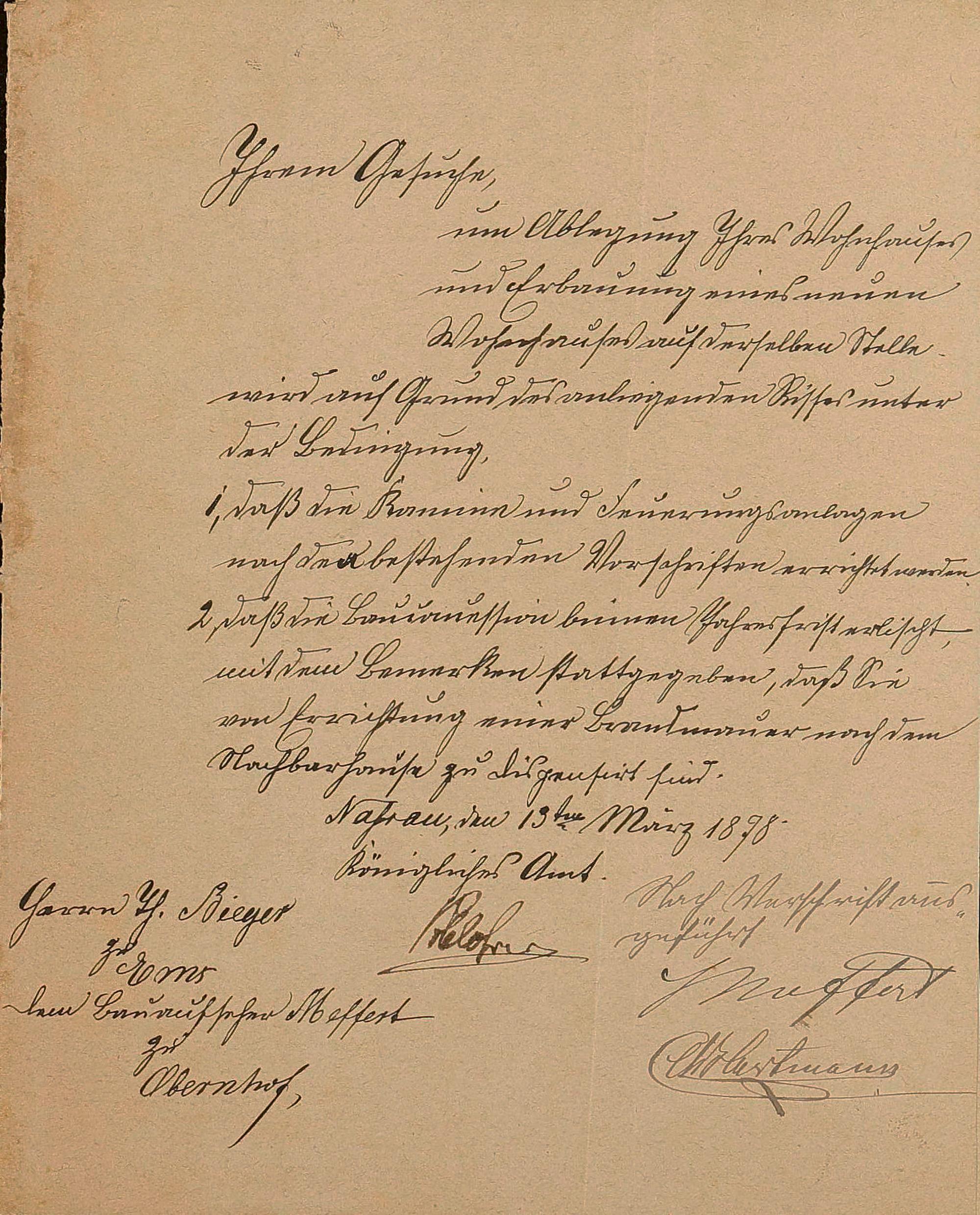 Abriss und Neubau des Hauses "Grüner Baum"/"Post" des August Häffner/Theodor August Bieger und Louise Henriette geb. Eisenberg/Erbengemeinschaft (Otto Johann Emil August Bieger + 6)/Adam Johann (gen. Max) Schülein/Rudolf Hinne Bad Ems Lahnstraße 4 Flur 84 Nr. 17