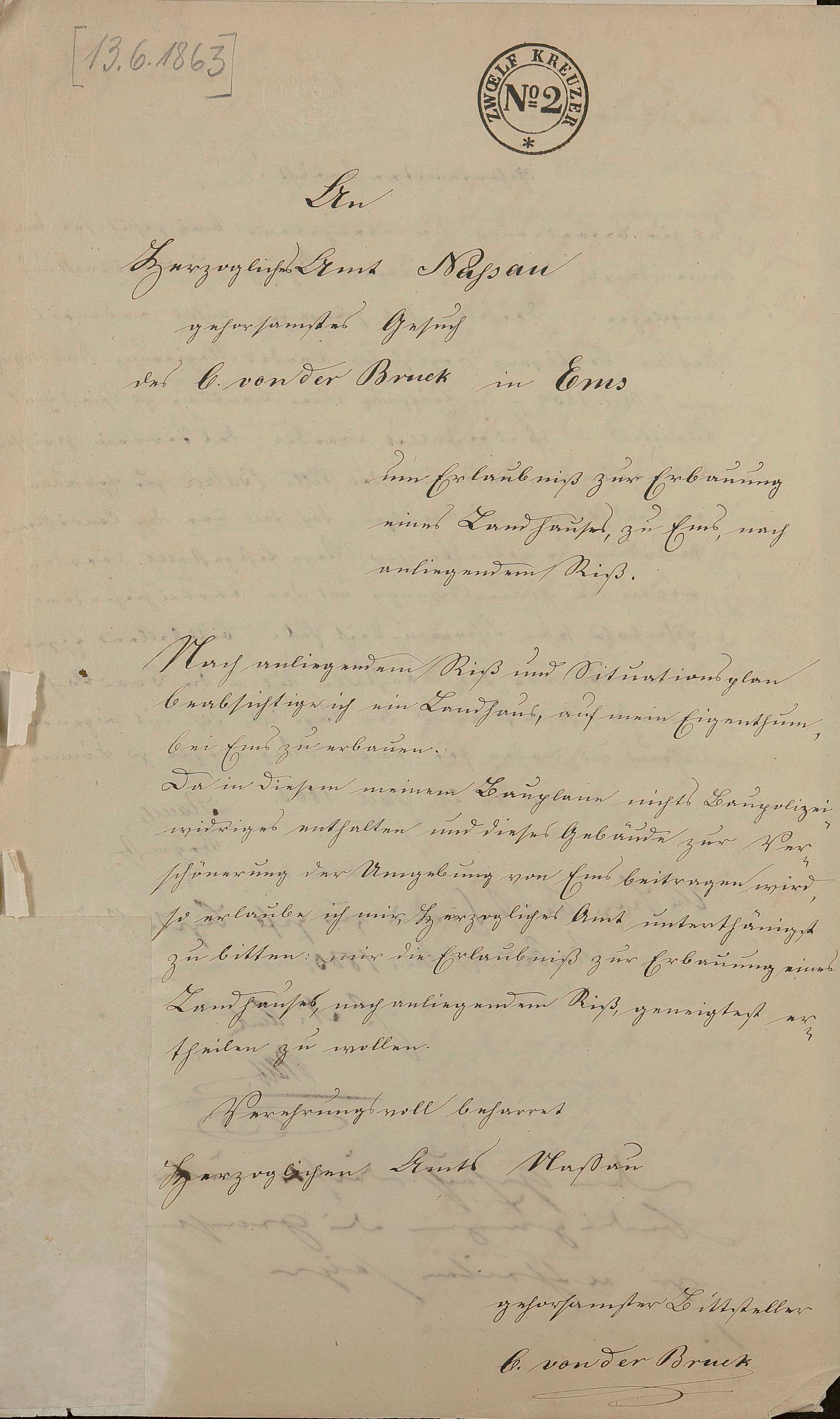 Bau der "Villa Reale"/Parkhotels des Christian von der Bruck und Wilhelmine geb. Linkenbach/Wilhelm von der Bruck und Helene geb. Jung/Helene Wiener geb. Jung/Oskar Treuter/Hans Müller und Karin Doris geb. Treuter/Karin Ernst/Karin Treuter Bad Ems Waldstraße/Malbergstraße Nr. 7 (3) Flur 89 Nr. 63/25