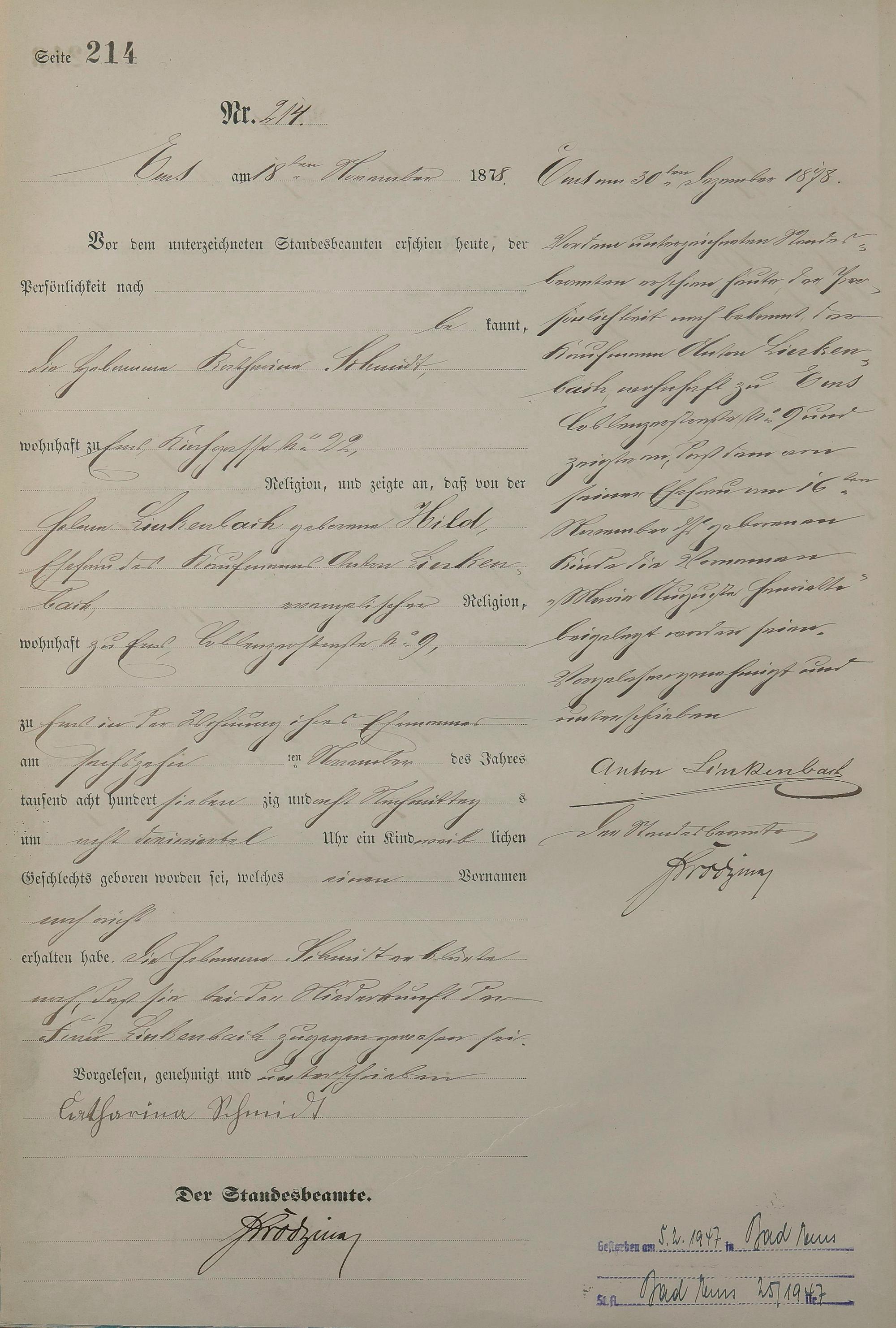 1254: Geburtsregister 1878
