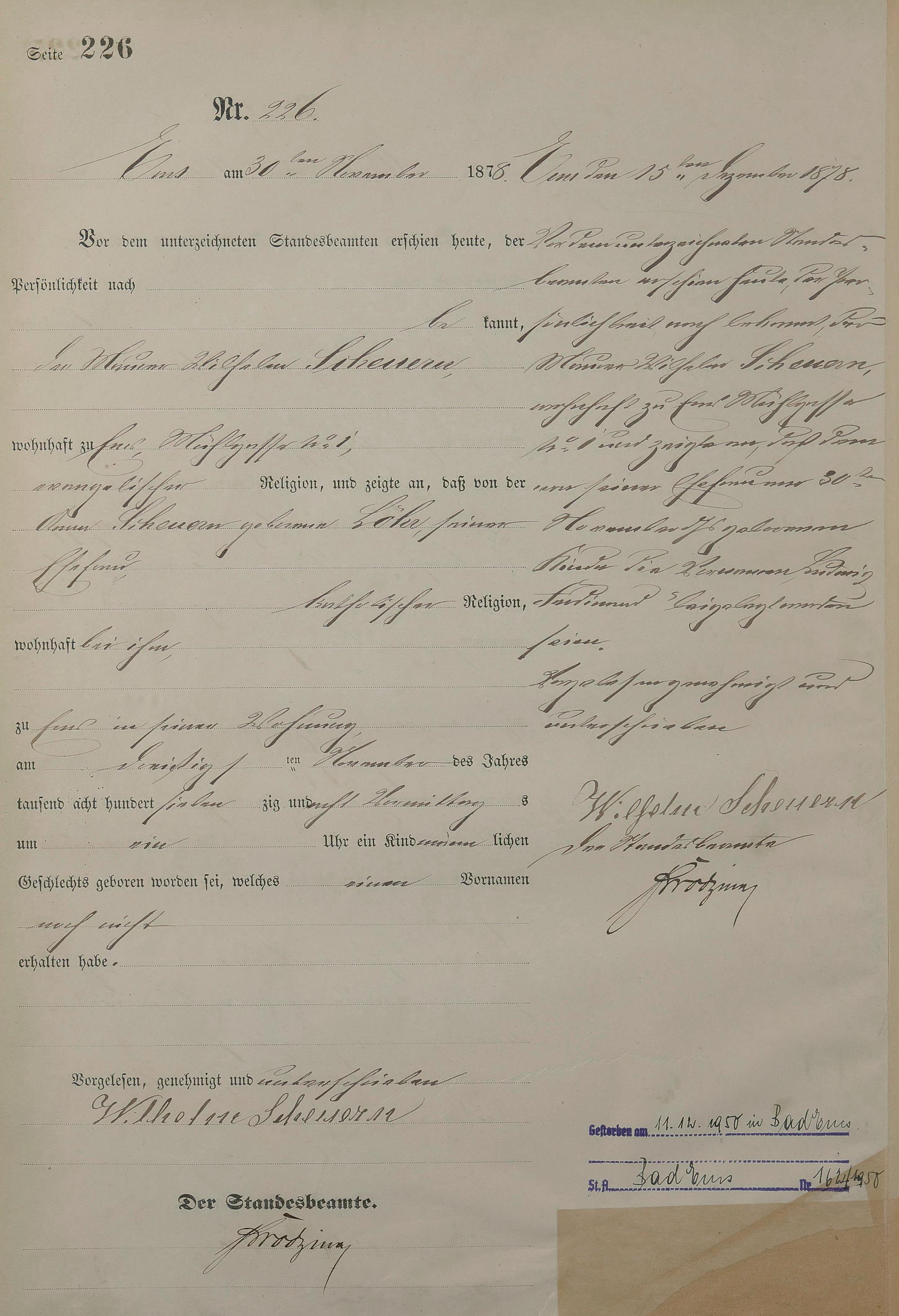 1254: Geburtsregister 1878