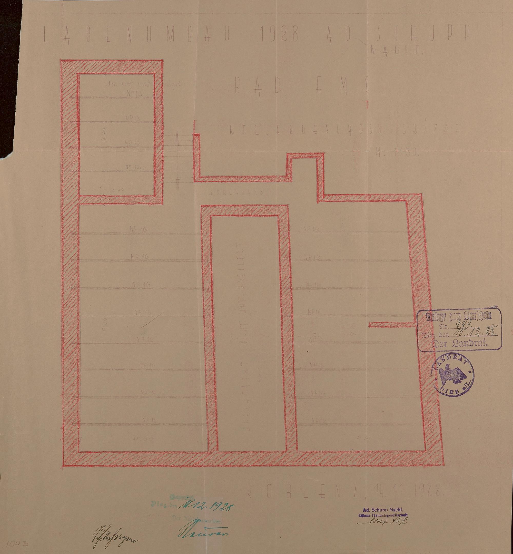 Ladenumbau der Klempnerei des Adolf Schupp Bad Ems Koblenzer Straße Nr. 3 - 7 Flur ? Nr. 38, 39, 40 - Nachtrag - Grundriss Keller