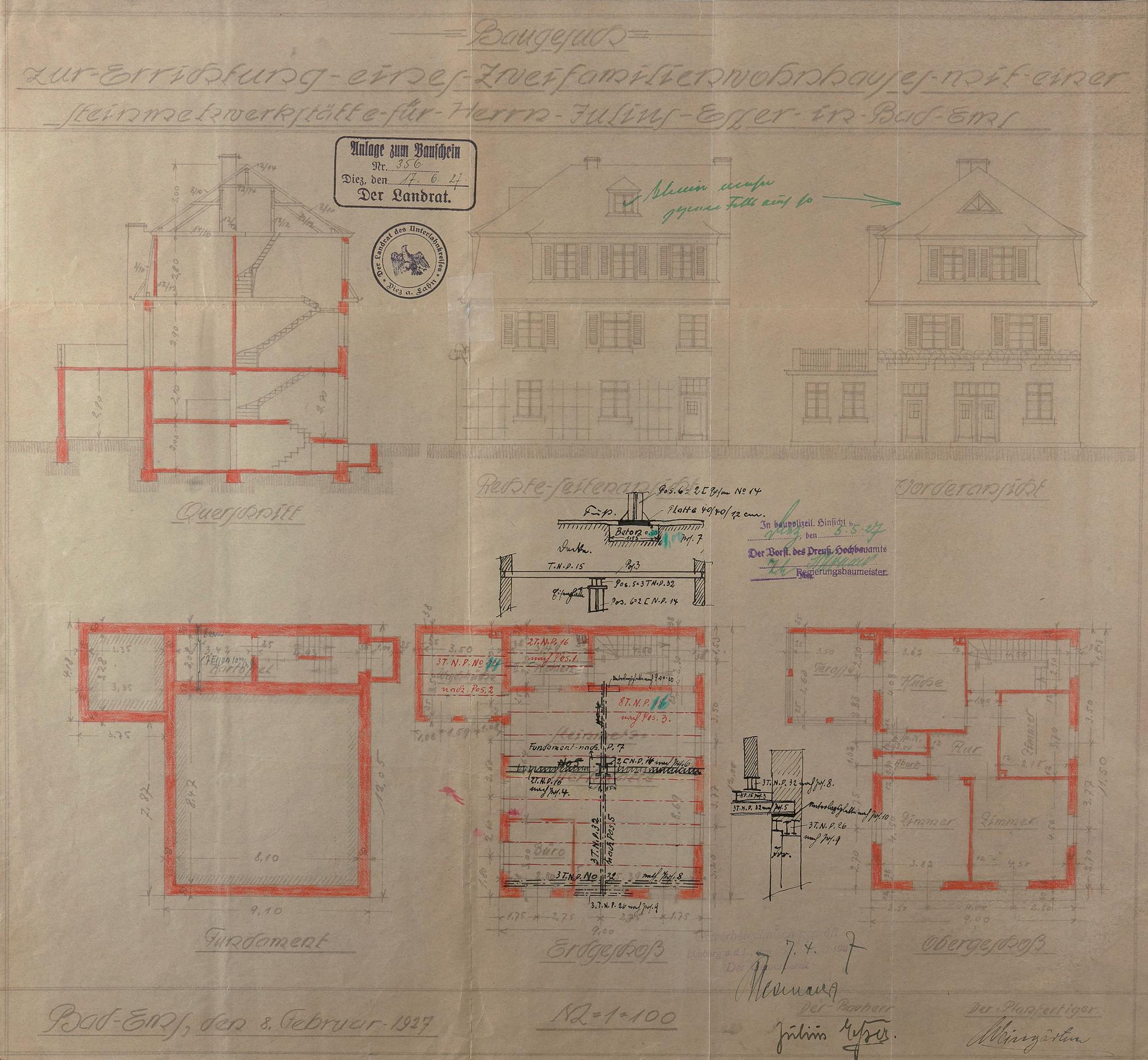 Zweifamilienwohnhaus des Julius Essers Bad Ems Große Wiese Nr. 1 Flur Nr. 35 - Ansichten, Schnitt und Grundrisse