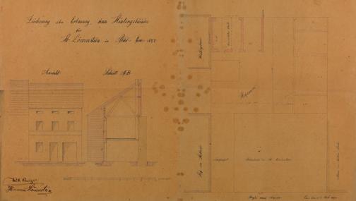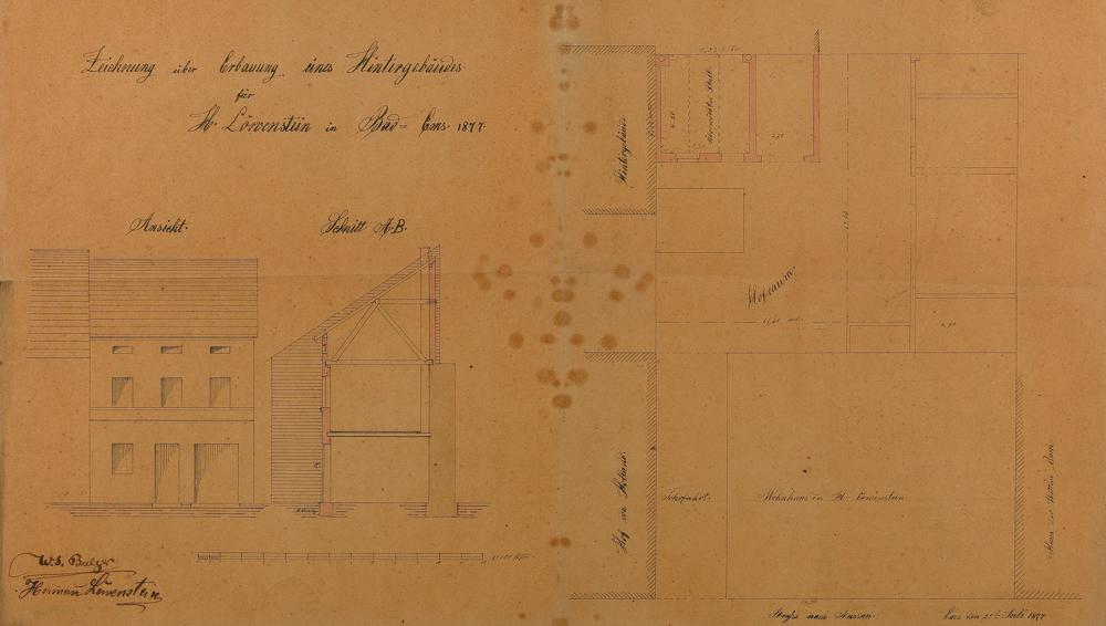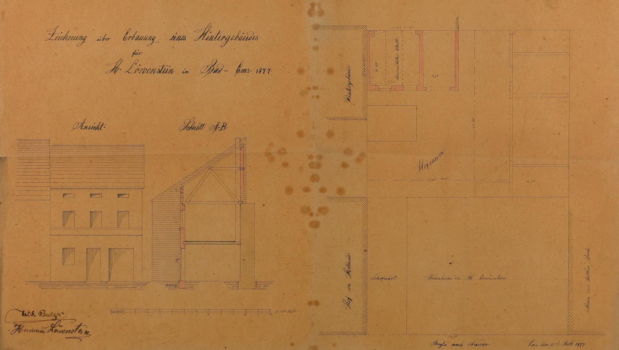 Hintergebäude des Hotels "Baierischer Hof"?/"Löwenstein" des Hermann Löwenstein/Eugen Goldfisch/Michael Thiex/Werner Rode/Lasys Immobilien/Thuong Ly/Lee Yanfen/Heyrath Werbetechnik Bad Ems Adolf-Hitler-Straße Nr. 22/Lahnstraße Nr. 22 Flur 84 Nr. 38, 39, 741 - Ansicht, Schnitt, Grundriss