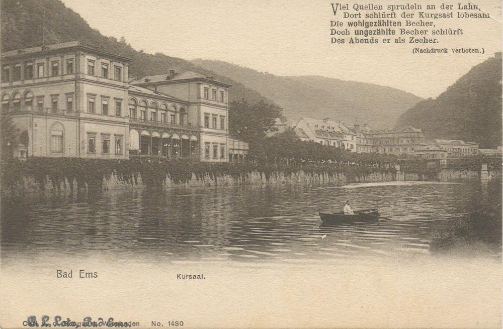 Lahnpartie mit Kursaal, Kurhaus/Kurhotel und Boot