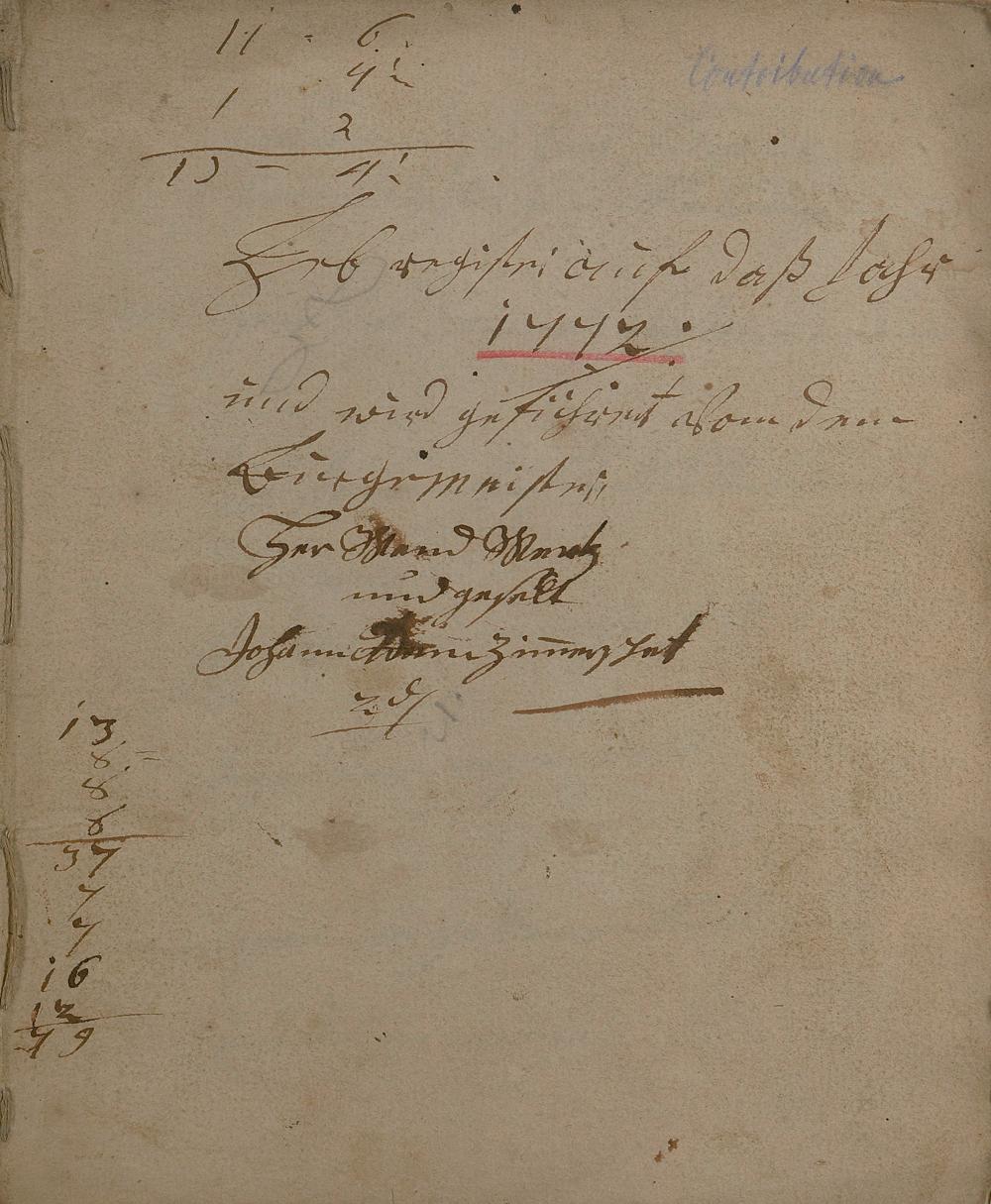 Kontributionsregister angefertigt von Bürgermeister Hermann Merz und Geselle Johann Adam Zimmerschied