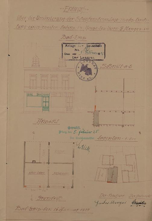 Fahrradladen des Gustav Menges und Luise geb. Zimmerschied/Sebastian Holler und Luise geb. Menges Bad Ems Bargasse/Koblenzer Straße Nr. 12 (77) Flur 104 Nr. 33/3 (33) - Ansicht, Schnitt, Grundriss und Lageplan