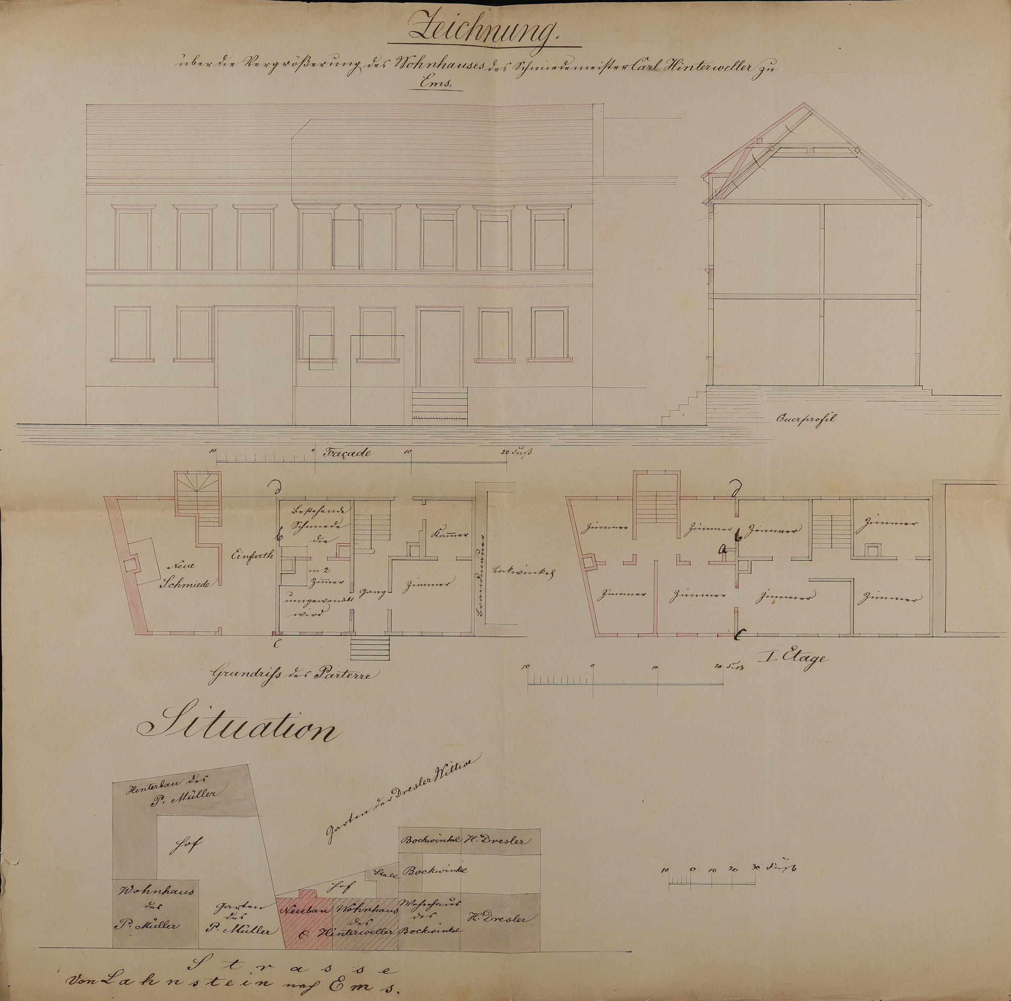 Anbau einer Schmiede und Umbau des Wohnhauses "Burg Sonneck" der Wilhelmine Hinterwäller/Carl Hinterwäller/Gustav Jacob und Marie geb. Zimmermann/Reinhold Jacob und Luise Therese (gen. Elisabeth) Jacob/Reinhold Jacob/Günther Jacob Bad Ems Römerstraße Nr. 68 und 69 Flur 98 Nr. 114 und 113