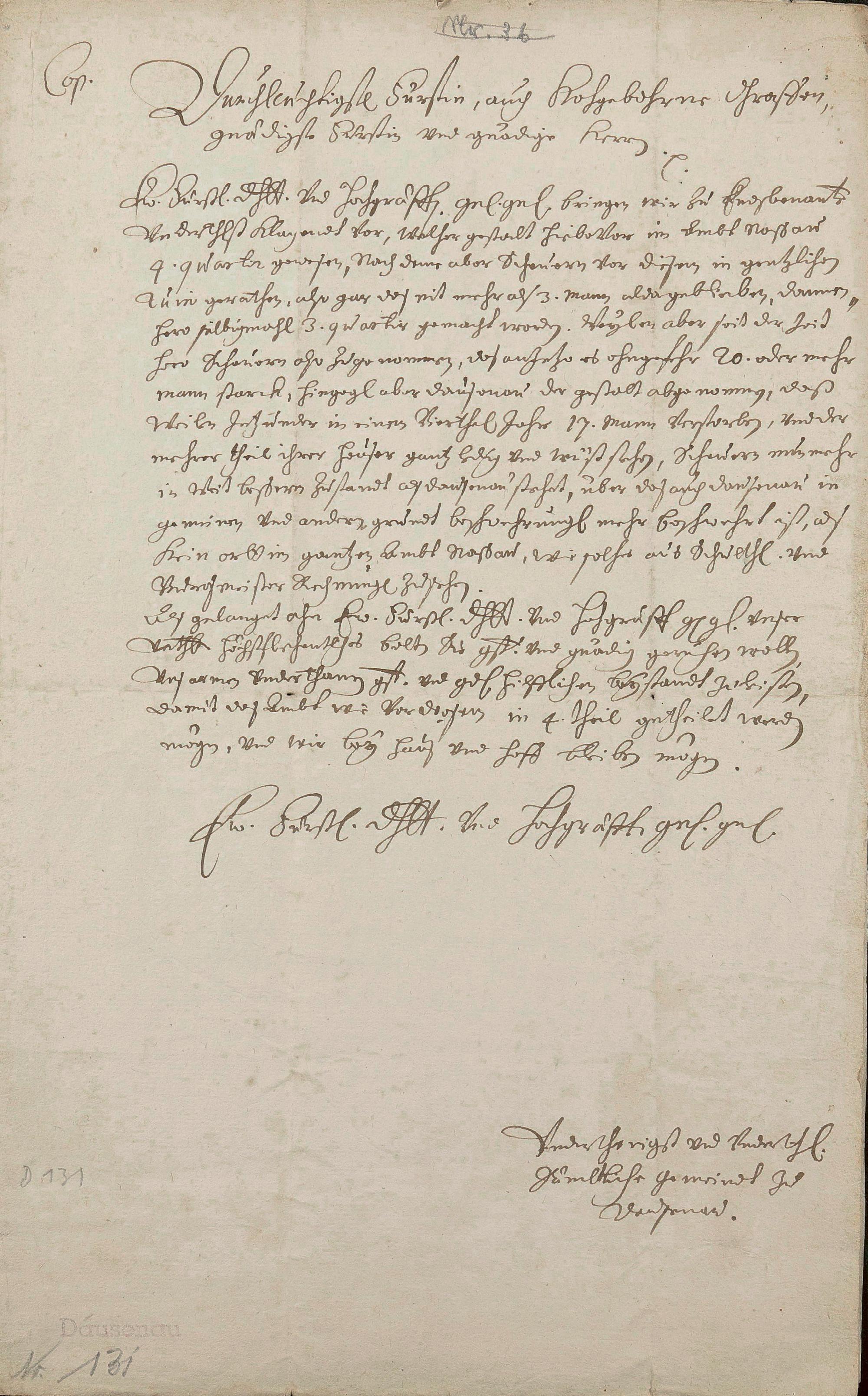 Die Gemeinde Dausenau bittet im Hinblick auf ihre schlechte Wirtschaftslage das Amt Nassau wieder in vier Quartiere zu teilen, nachdem das sehr heruntergekommene Scheuern wieder erblüht, dagegen Dausenau verfallen ist. Es wurde ein Bericht der Amtleute Konrad von Bentheim und Johann Plebanus angefordert.