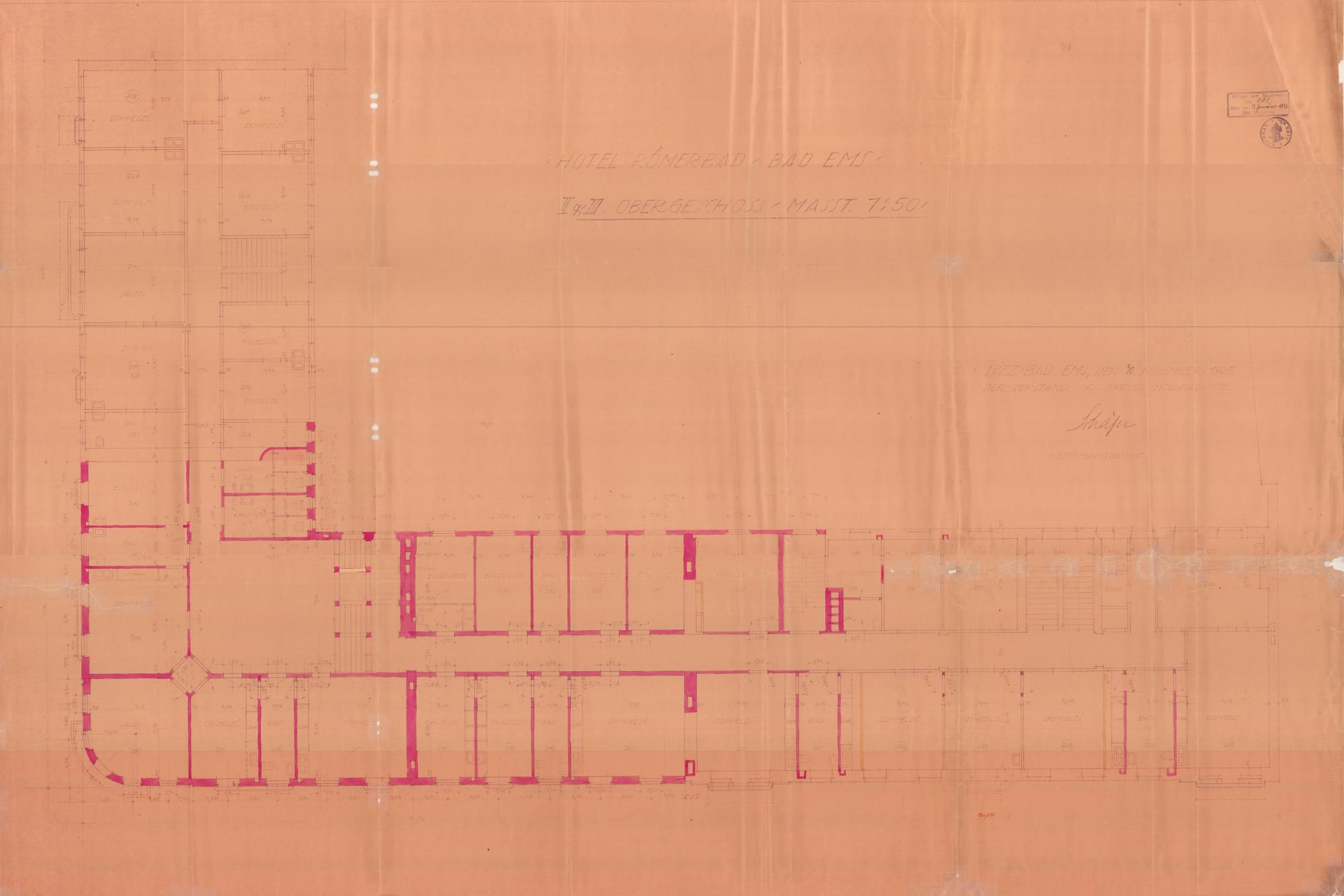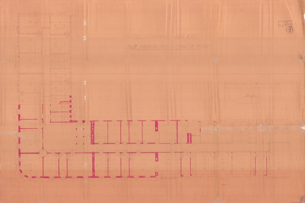 Um- und Neubau des Hotels "Pariser Hof"/"Römerbad" des Heinrich Maurer/Georg Christian Maurer/Königlich Preußische Domänenverwaltung/Karl Rücker Bad Ems Mainzer Straße Nr. 16 Flur 83 Nr. 4/1 (2) - Grundriss 2. und 3. Obergeschoss