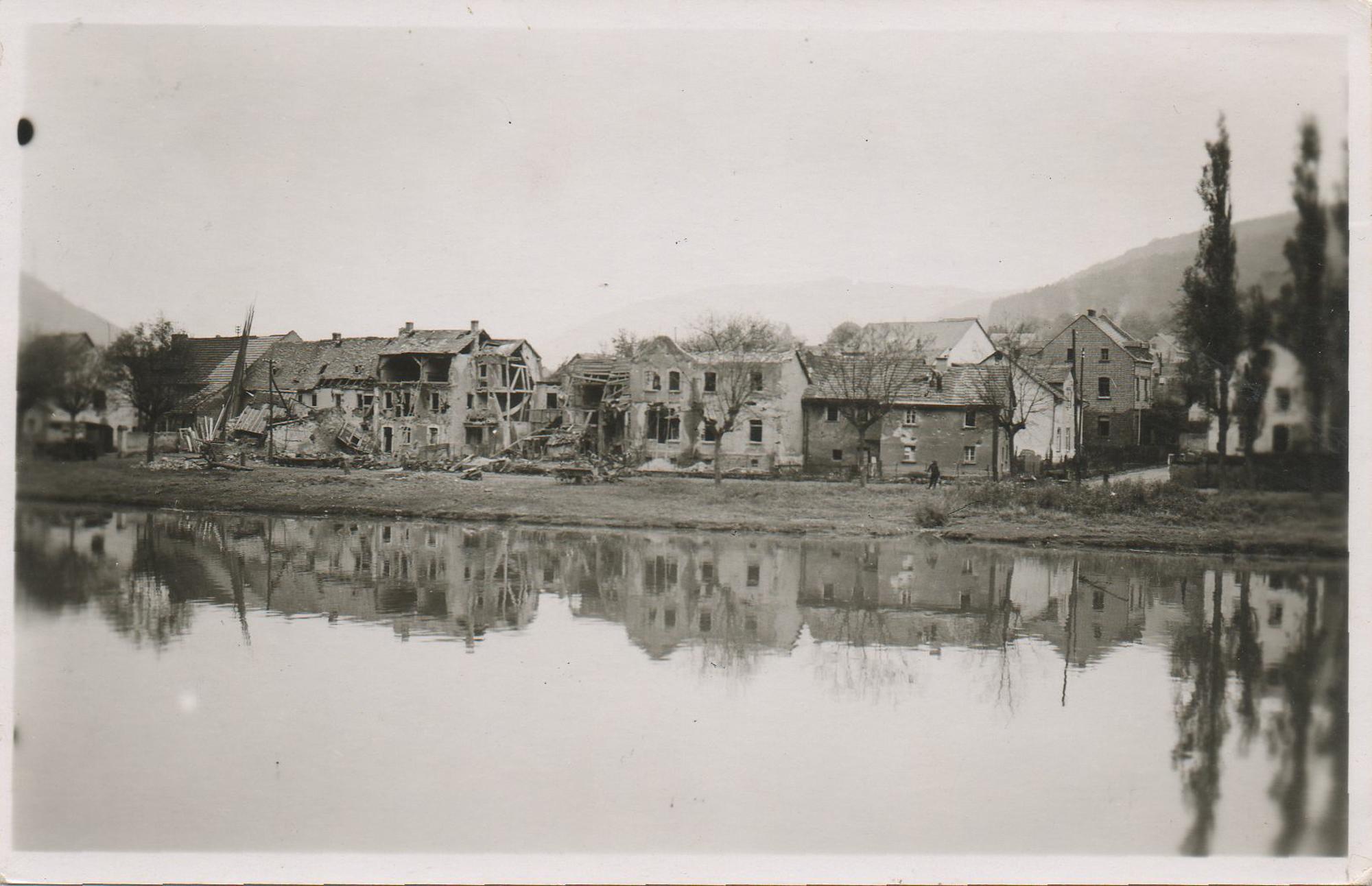 Lahnpartie mit zerstörten Häusern nach dem Bombenangriff am 20. Okt. 1944