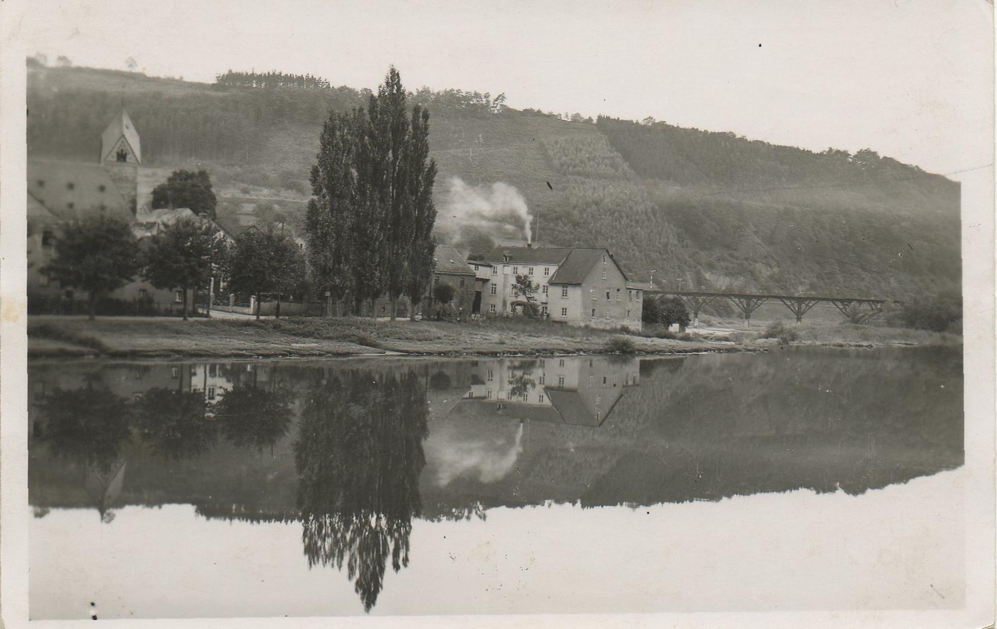 Lahnpartie mit St. Katharina Kirche und Eisenbahnbrücke