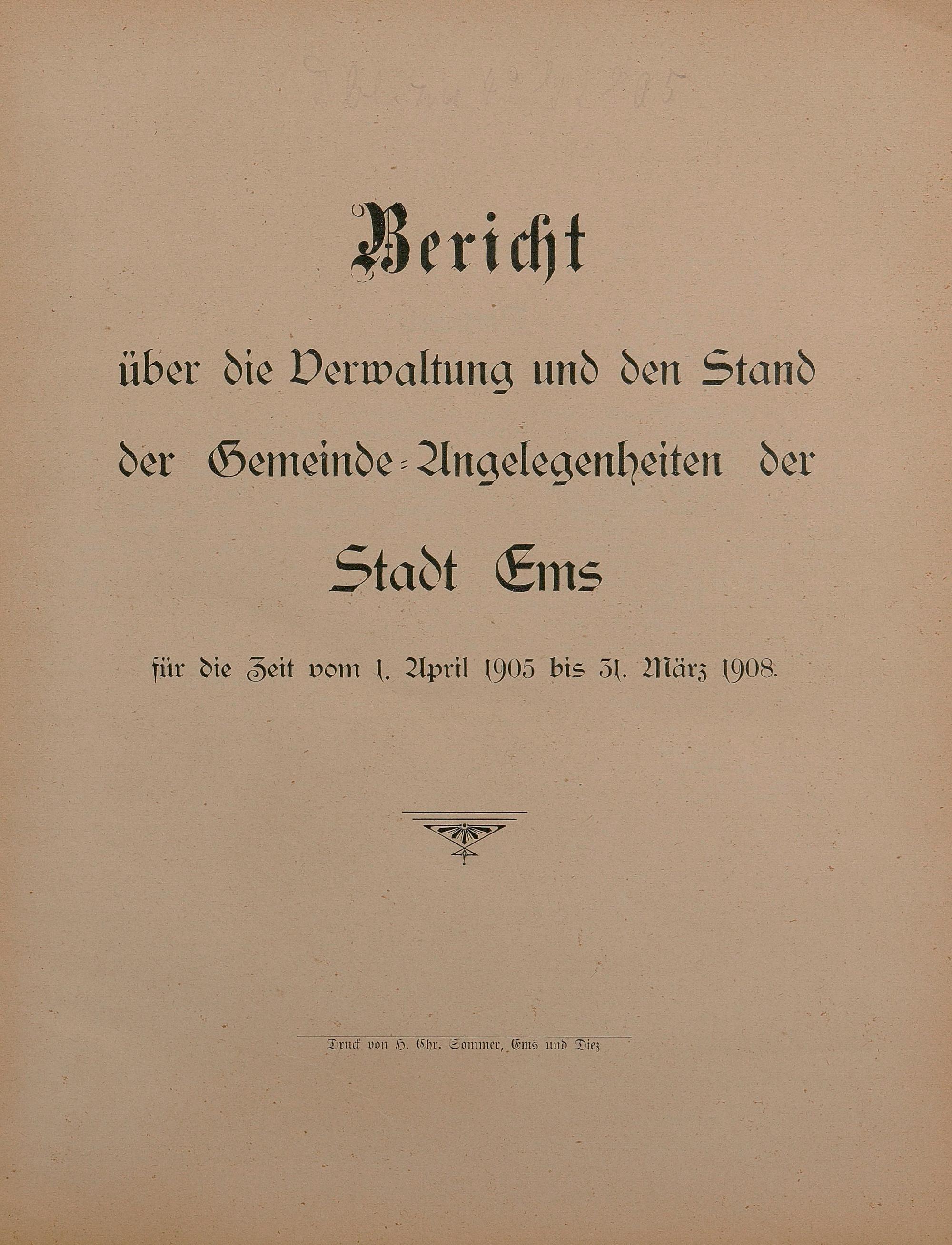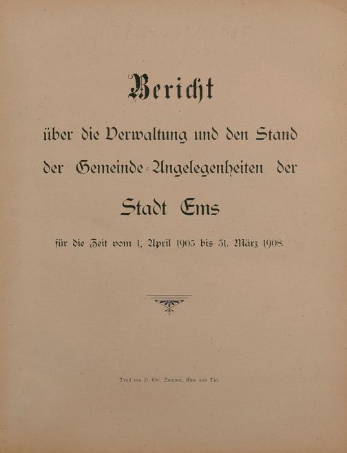 Bericht über die Verwaltung und den Stand der Gemeindeangelegenheiten der Stadt Ems für die Zeit vom 1. April 1905 bis 31. März 1908