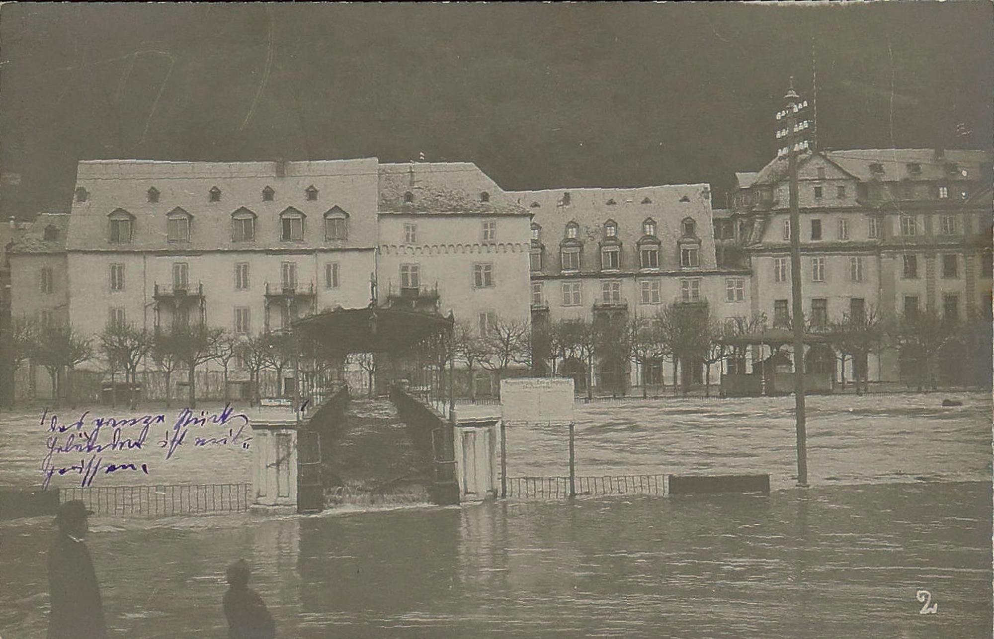Lahnpartie mit Kurhaus/Kurhotel und Gitterbrücke bei Hochwasser
