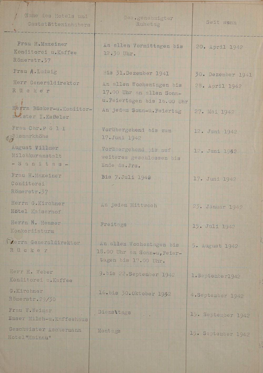 Gasthäuserliste mit Ruhetagen 1941 - 1943