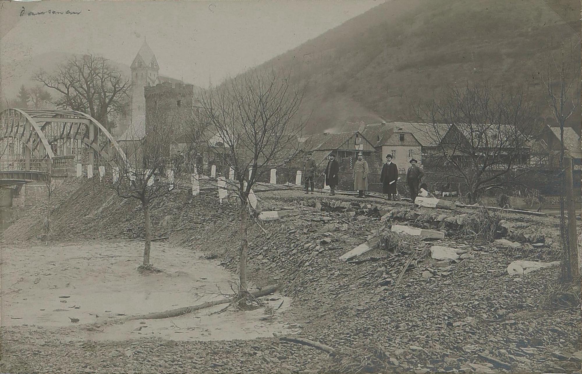 Hochwasser Dausenau - Hallgarten (B 260) mit Lahnbrücke, Stadttor und Kirche