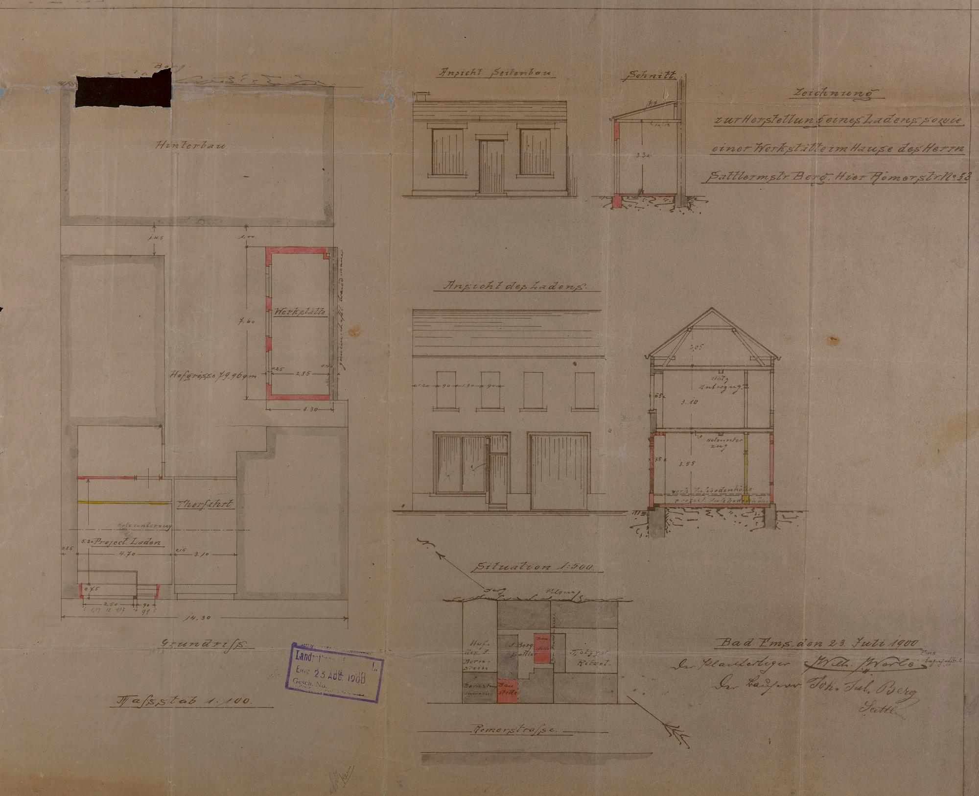 Laden und Werkstatt des Hauses "Zum Lahntal"/"Lahntal" des Johann Julius (Jean) Berg und Elise geb. Berchem/Christian Kaffine/Philipp Schulz und Maria geb. Köpper/Hans Alfred Schulz/Karl Christian Schulz/Heinrich Schulz/W. A. Henninger Bad Ems Römerstraße Nr. 55 (64) Flur 92 Nr. 8 (2, 17, 19) - Ansichten, Schnitte, Grundriss und Lageplan