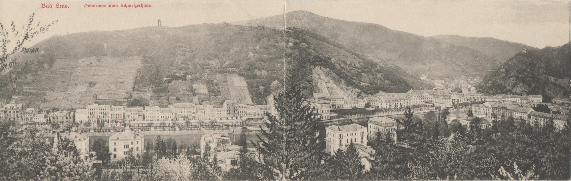 Total von Süden mit Römerstraße, Grabenstraße, Wilhelmsallee, Kurviertel, Kursaal und Bismarckturm.