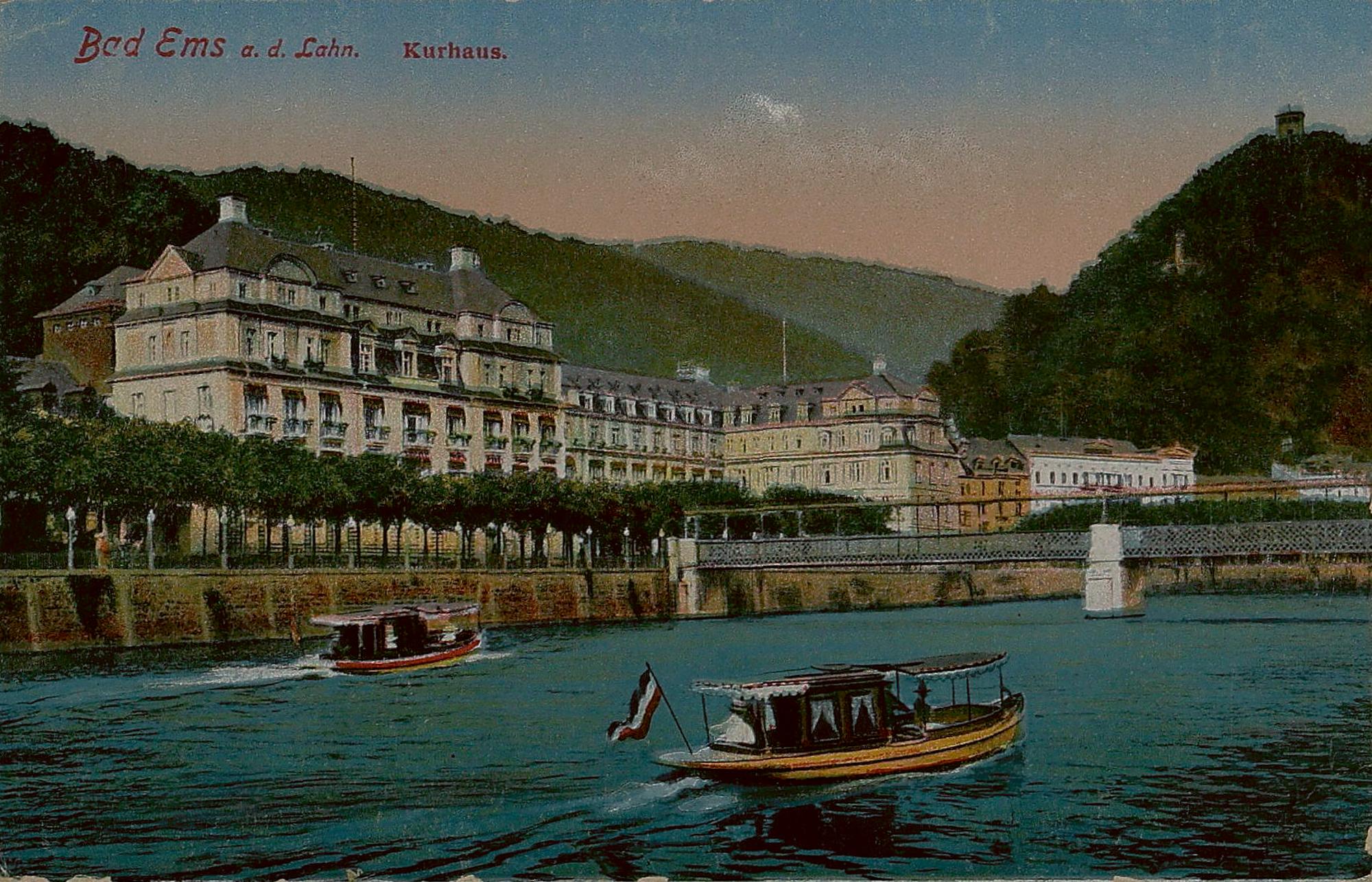 Lahnpartie mit Kurhaus/Kurhotel, Gitternetzbrücke, Bäderley und Ausflugsschiffen