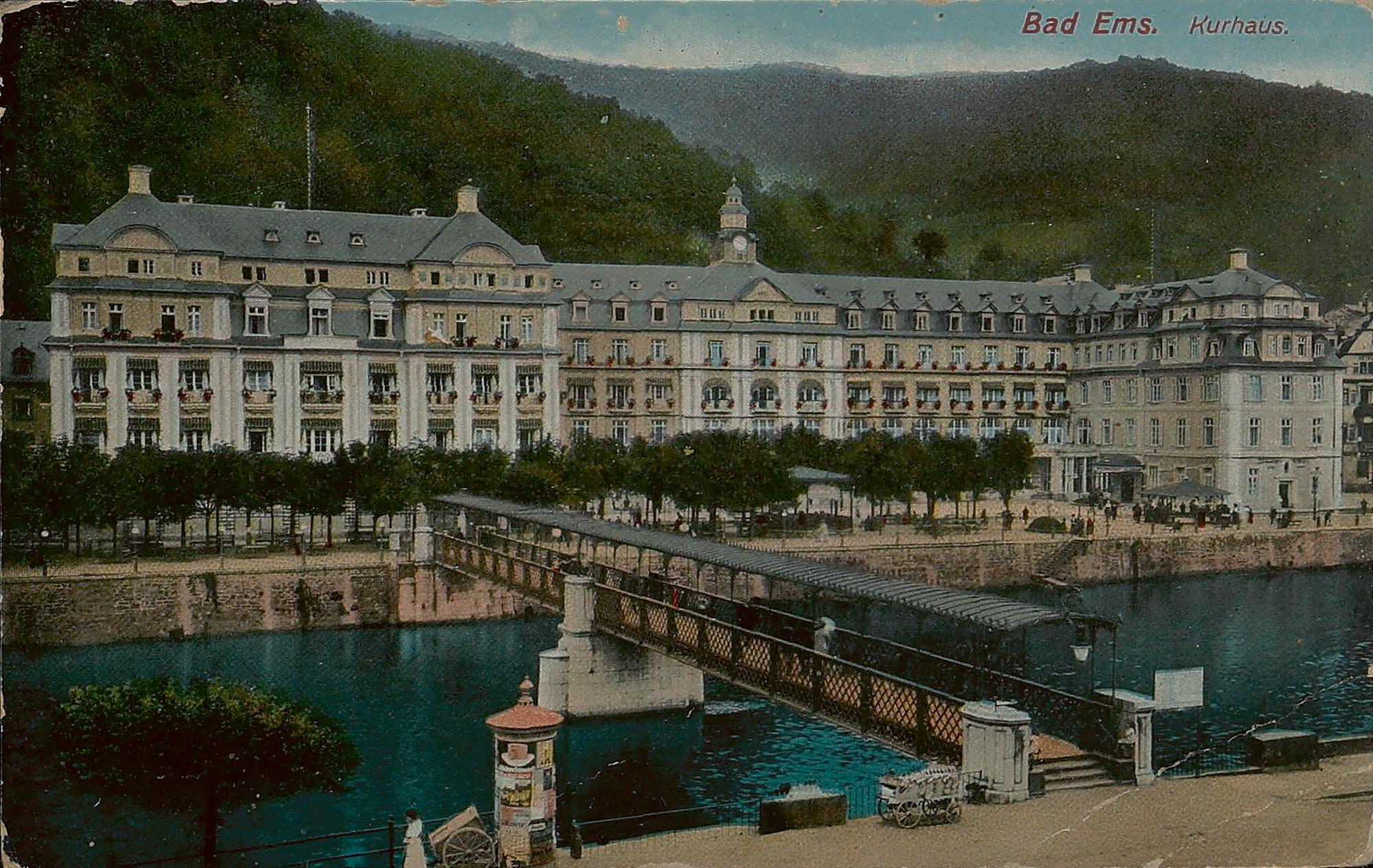 Lahnpartie mit Kurhaus/Kurhotel, Gitternetzbrücke und Litfaß-Säule