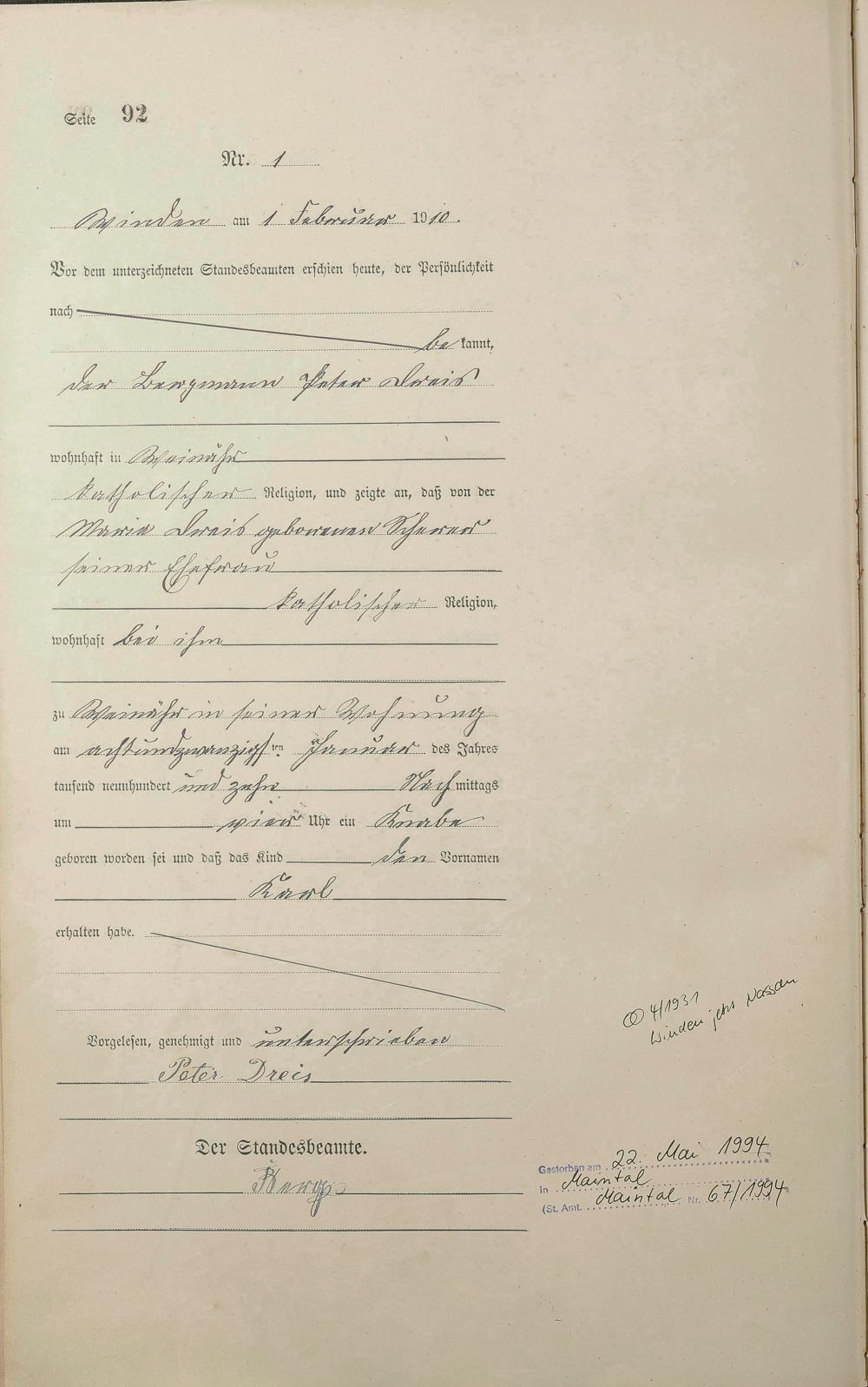 Geburtsregister 1910